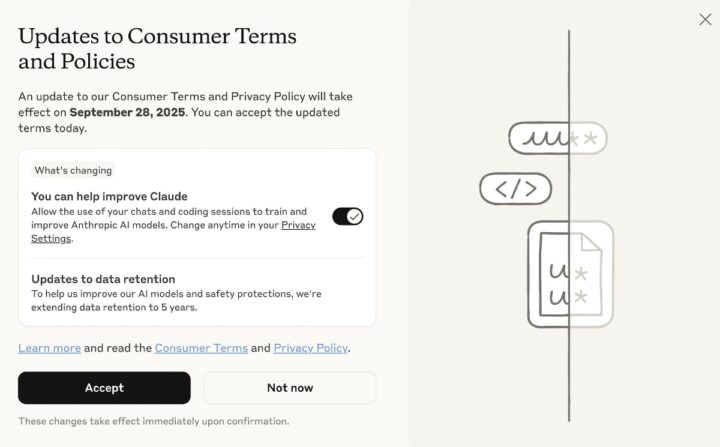 Die Änderung sieht vor, dass alle neuen Chats und Programmiersitzungen sowie fortgeführte ältere Konversationen von Anthropic analysiert und gespeichert werden dürfen, und das für einen Zeitraum von bis zu fünf Jahren. Umgesetzt wird dies durch eine Einblendung, die euch über die neuen Richtlinien informiert. Der Haken dabei: Während ein großer Button zur Zustimmung einlädt, ist die eigentliche Option zur Datennutzung ein kleinerer, standardmäßig aktivierter Schalter. Es ist also davon auszugehen, dass viele von euch der Datennutzung zustimmen, ohne es bewusst zu entscheiden. Ihr habt bis zum 28. September Zeit, eine Entscheidung zu treffen.