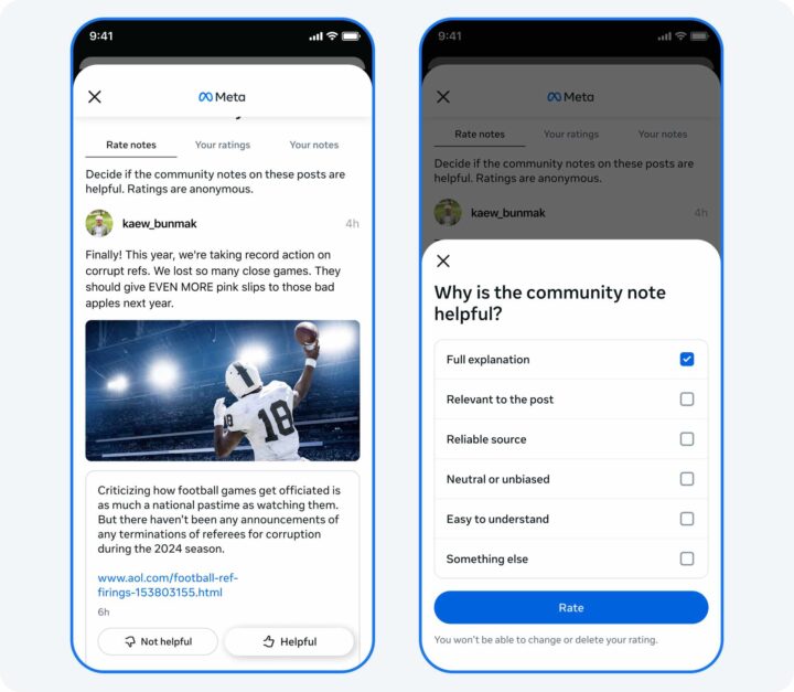 Im Grunde ähnelt das neue System eben dem von X, was Meta auch so einräumt. Community-Notes werden dabei jeweils erst freigegeben, wenn weitere Teilnehmer an dem Programm sie abnicken. Es sollen also keine Anmerkungen und Notizen einfach beliebig durchrauschen. Es soll aber nicht um Mehrheiten gehen: Community-Notes werden erst dann freigegeben, wenn Teilnehmer mit üblicherweise gegensätzlichen Ansichten sie gleichermaßen als hilfreich erachten.