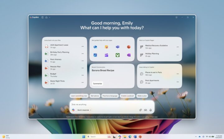 Beim Start der App fällt direkt die neu gestaltete Oberfläche ins Auge. Copilot präsentiert hier nun eine zentrale Anlaufstelle, die schnellen Zugriff auf kürzlich verwendete Dateien, Anwendungen und vergangene Chats bietet. So soll man nahtlos an vorherige Aktionen anknüpfen können. Es lässt sich beispielsweise eine kürzlich bearbeitete Datei mit einem Klick in das Chatfenster laden, um sie von Copilot analysieren oder zusammenfassen zu lassen. Bei Anwendungen bietet Copilot eine „geführte Hilfe“ an: Wählt man eine App aus, startet eine Vision-Sitzung, die den Nutzer in Echtzeit bei der Bedienung des Programms auf dem Bildschirm unterstützt.