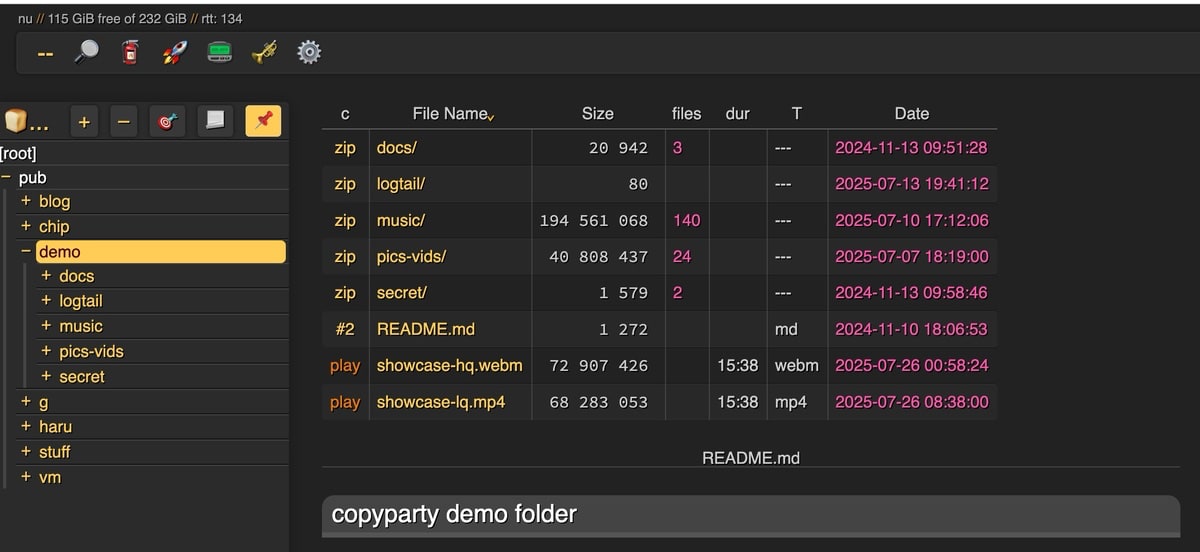 Wer sich ein Bild machen möchte, kann einen Demo-Server besuchen, der auf einem NUC im Keller des norwegischen Entwicklers läuft. Das Projekt zeigt, dass Fileserver nicht kompliziert sein müssen. Während erfahrene Nutzer möglicherweise lieber einzelne Dienste manuell konfigurieren, bietet Copyparty einen niedrigschwelligen Einstieg in die Welt der Fileserver. Befassen soll man sich dennoch damit, man will sicherlich nicht Dinge freigeben, auf die niemand Zugriff haben soll. Ebenso muss man sich etwas in die GUI einfuchsen. Ich empfehle euch auch einen Blick auf das herrlich nerdige Video: