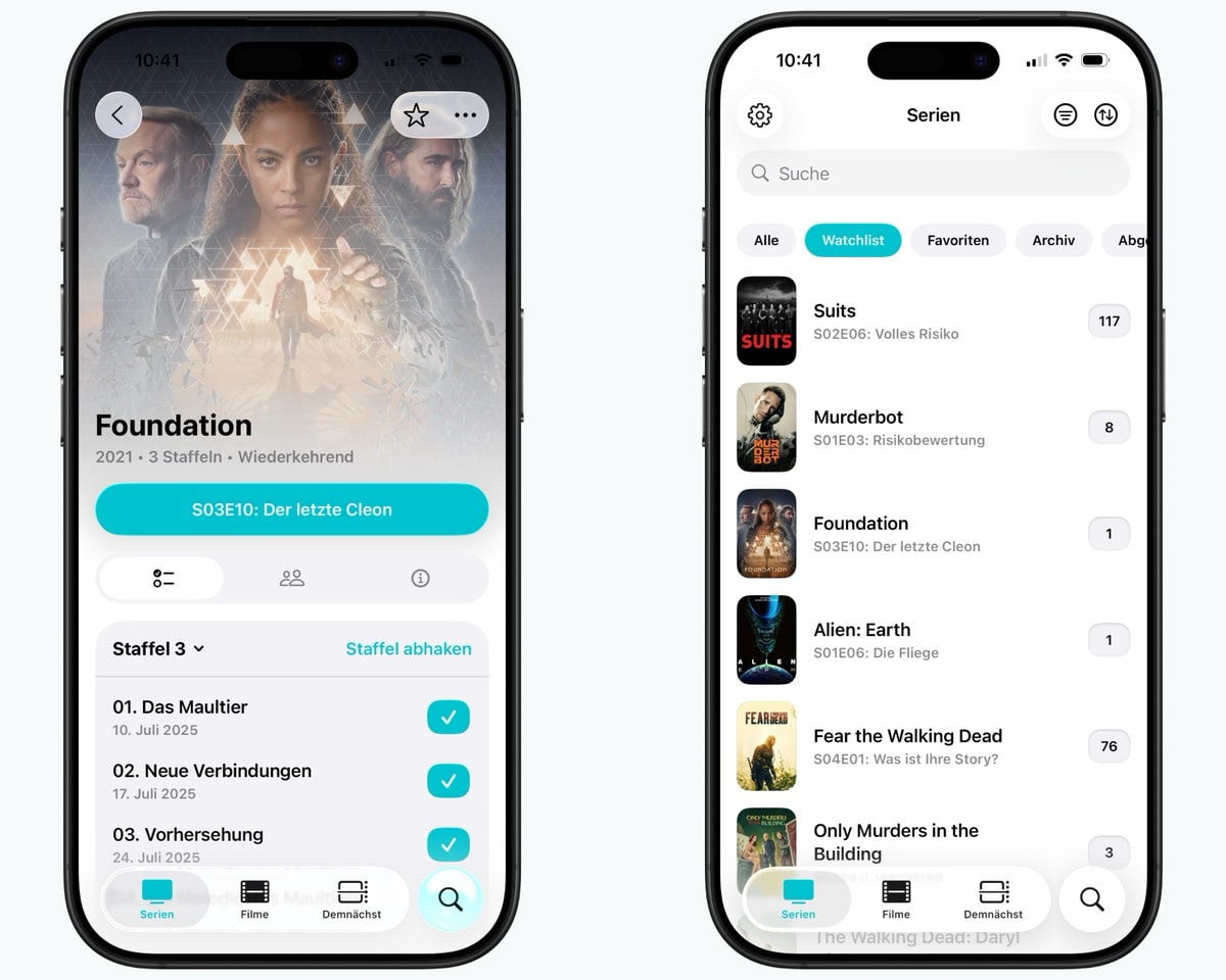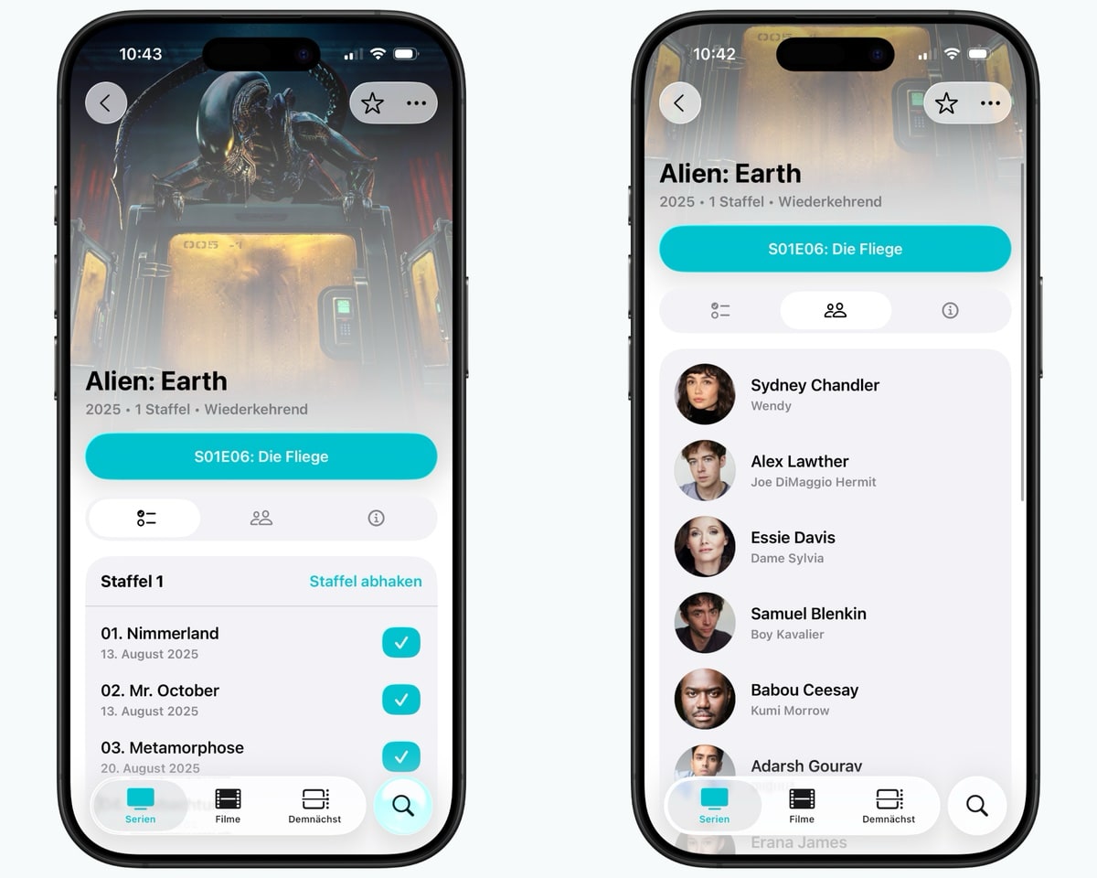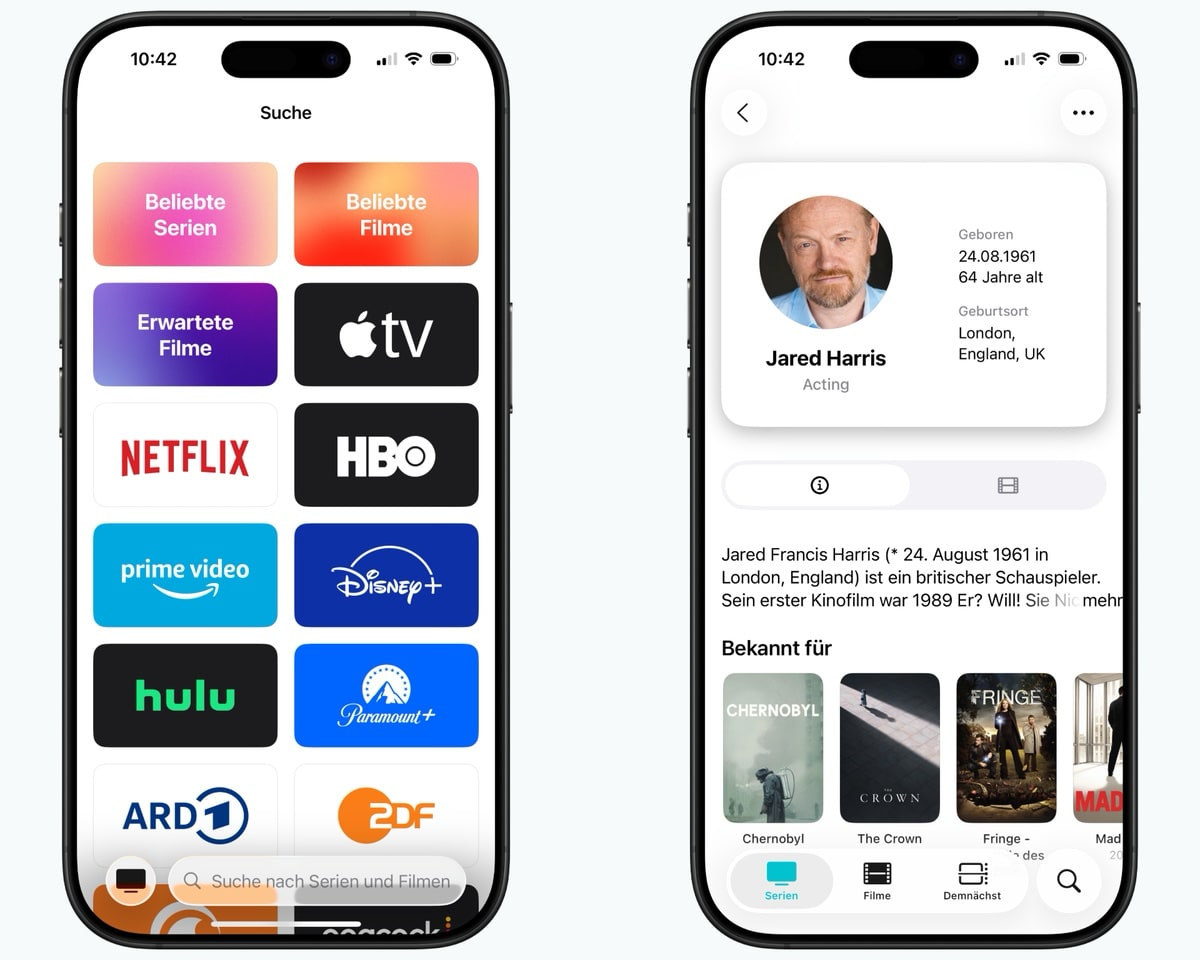 Ich habe beispielsweise verschiedene Serien, die ich tracke. Manche befinden sich im Lauf, andere sind bereits durch – so verliere ich nie den Überblick. Wobei CouchTimes ja viel mehr kann, ich selbst nutze ja nicht wirklich alle Funktionen. Die Detail-Ansichten wurden beispielsweise komplett überarbeitet und bieten jetzt Trailer, Cast-Informationen und Empfehlungen. Auch die Schauspieler-Profile sind deutlich informativer geworden, mit Biografien und kompletten Filmografien. Für Streaming-Fans gibt es eine verbesserte Integration der Verfügbarkeits-Anzeige. Mit einem Blick sieht man, wo der gewünschte Content gerade verfügbar ist. Die neuen Smart Notifications erinnern euch auf Wunsch an Starttermine.