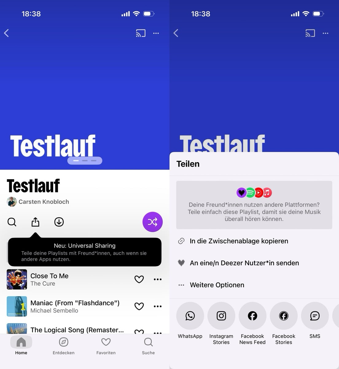 Wird eine Playlist geteilt, erstellt Deezer einen universellen Link. Öffnet jemand diesen Link, erkennt das System die entsprechenden Tracks auf der jeweiligen Zielplattform und leitet automatisch zur richtigen Version weiter. Die neue Funktion ist ab sofort für alle Deezer-Nutzer verfügbar. Wer also demnächst eine coole Playlist zusammenstellt, kann diese problemlos mit der ganzen Clique teilen – egal welchen Streaming-Dienst die anderen nutzen. Letzten Endes: Ihr teilt die Playliste, der Empfänger klickt in der Web-Ansicht auf den Export und wählt seinen Dienst aus, fertig.