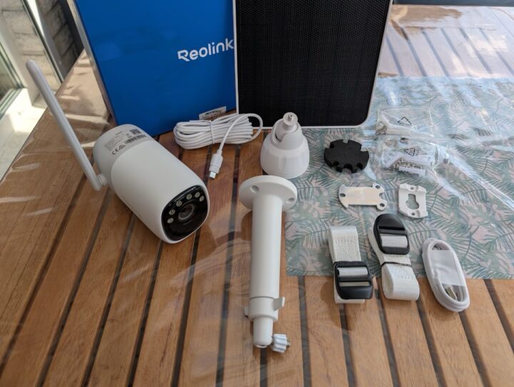 Im Lieferumfang befindet sich neben dem Panel und er Kamera auch noch allerhand Befestigungsmaterial für beide Geräte, darin auch zwei Gurte, mit denen sich das Ganze optional an Rohren befestigen ließe. In meinem Fall wurde die Altas dann aber an eine ältere, bereits vormontierte Halterung von Reolink angebracht, da ich jene seinerzeit für genau den Einsatz dort fest installierte. Zu beachten ist in dem Fall aber, dass die Altas durch den Akku nicht unbedingt ein Leichtgewicht ist. Die Halterung muss auf das Gewicht also auch ausgelegt sein, sonst neigt sich die Kamera irgendwann von alleine nach unten.
