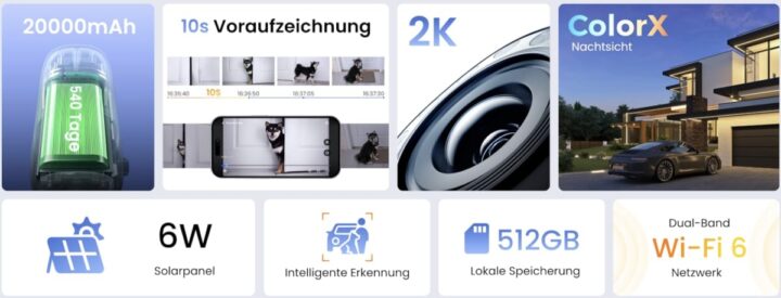 Mit der Reolink Altas präsentiert das Unternehmen eine 4-MP-Sicherheitskamera für die Verwendung im Innen- vor allem aber auch im Außenbereich. Neben ColorX-Nachtsicht ist eines der sicherlich interessantesten Features die 10-sekündige Voraufzeichnungsfunktion. Das Gerät zeichnet also bereits 10 Sekunden vor der eigentlichen PIR-Erkennungsaufzeichnung auf, was da vor der Kamera passiert, um möglichst alles vom Geschehen mitzunehmen. Ansonsten wichtig, zu wissen: Die Kamera arbeitet mit einem integrierten 20.000 mAh-Akku, der manuell, optional – und sinnvollerweise – aber auch per mitgeliefertem 6-W-Solarpanel mit USB-C-Anschluss mit Strom versorgt werden kann.