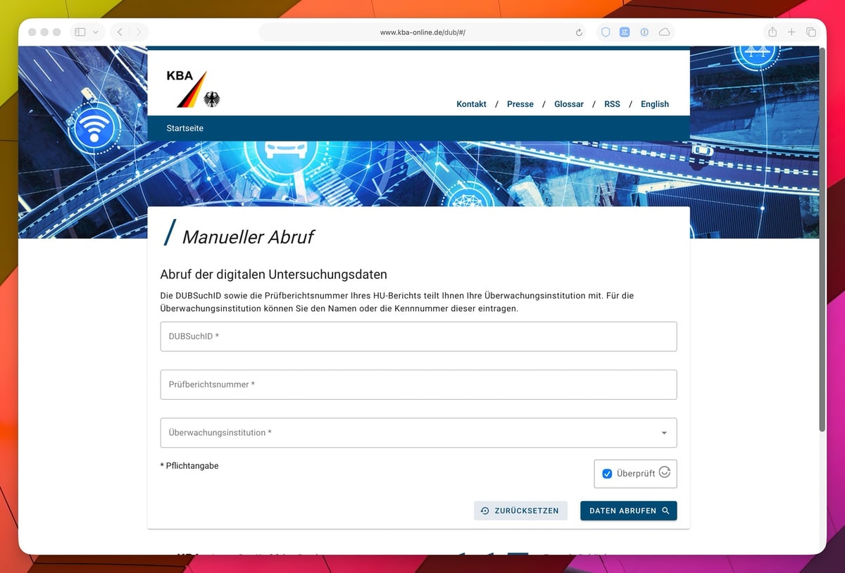 Fahrzeughalter greifen über die Website des KBA auf den digitalen Bericht zu. Zur Auswahl stehen QR-Code, direkter Link oder der manuelle Abruf über ein Formular. Für den Zugang braucht es drei Angaben: die Nummer des HU-Untersuchungsberichts, die Schlüsselnummer der Überwachungsinstitution und eine zusätzliche Identifikationsnummer. Ohne diese Kombination gibt es keinen Zugriff.
