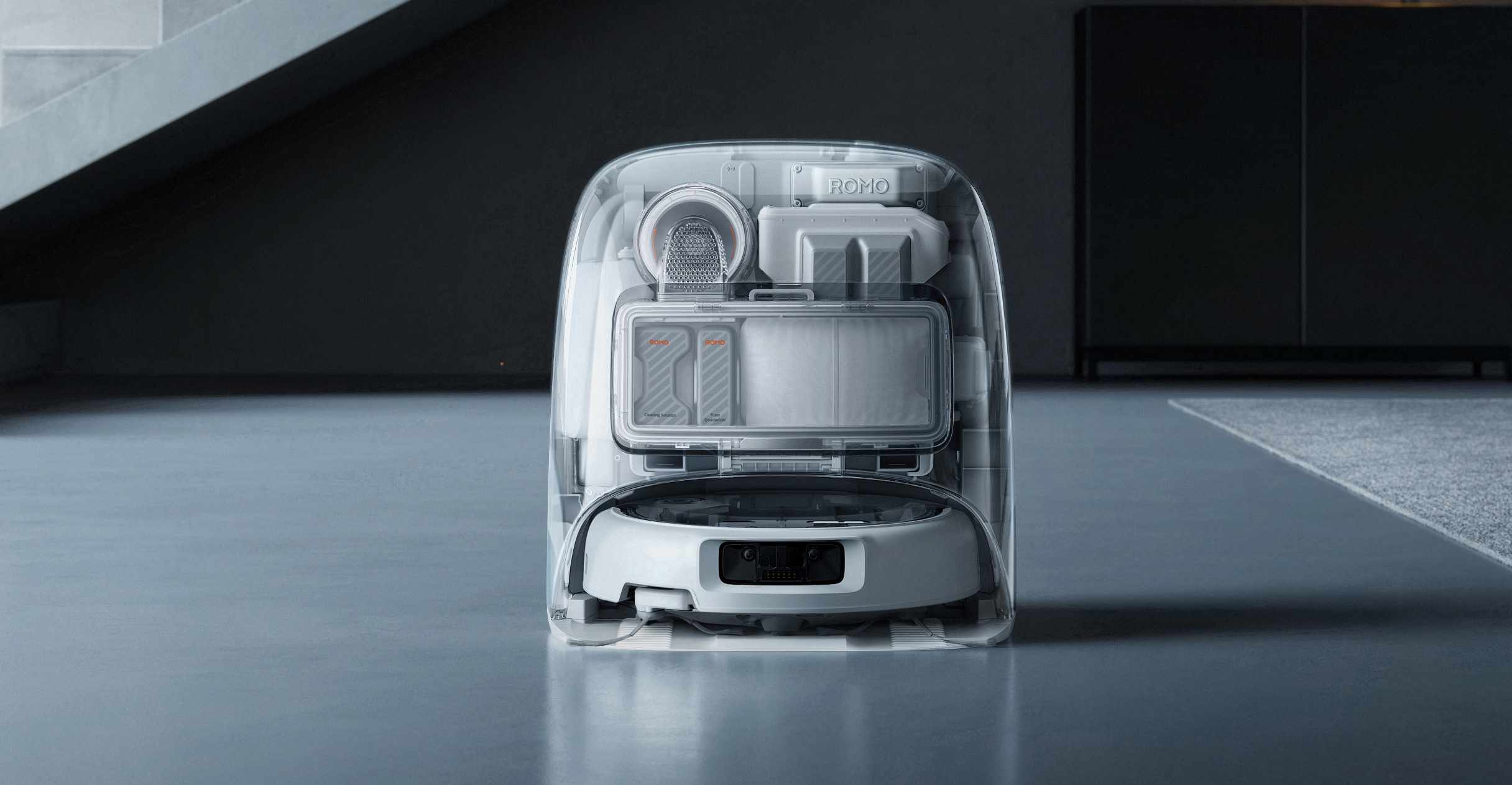 In den Wassertank Roboters passen 164 ml. Den Wasserfluss zu den Mopps kann er je nach erkannter Verschmutzung automatisch anpassen. Der Romo P bringt im Übrigen ein zusätzliches Fach für Konzentrate mit, sodass je nach Reinigungsauftrag z. B. eine fettlösende Reinigungslösung mitgegeben werden kann – oder einfach ein Dufterfrischer.