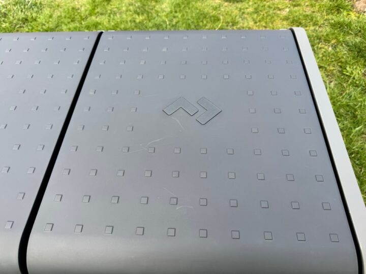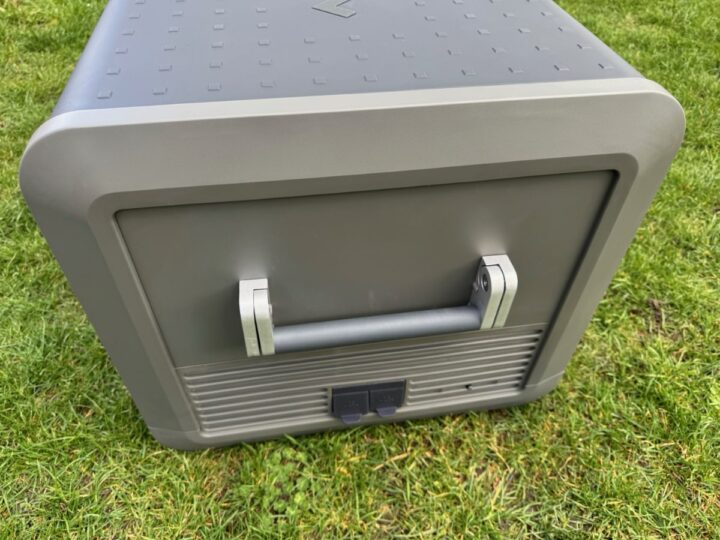 Auf den ersten Blick strahlt der CFX5 einen robusten Charme aus. Die stabile Konstruktion mit verstärkten Ecken und Kanten sorgt dafür, dass er den Strapazen von Outdoor-Abenteuern standhalten soll. Die sehr robust wirkenden Aluminiumgriffe sind mit einer starken Feder ausgestattet, sodass sie schnell wieder in ihren Ursprungszustand zurückkehren können. Außerdem vermitteln sie den Eindruck, dass sie ordentlich Gewicht aushalten können. Ich vermisse jedoch ein wenig Rollen. Die würden dem Gerät noch mehr Mobilität verleihen, denn die große Box, die ich hier habe, ist selbst leer allein aufgrund der Größe nur schwer tragbar.