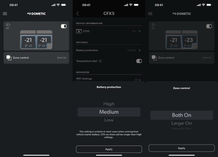 Der CFX5 ist mit Dometics VMSO 3.5-Kompressor ausgestattet, der die Motorgeschwindigkeit variabel optimieren und konstant anpassen soll, um die eingestellte Temperatur zu halten. Er kann bis auf niedrige –22 °C kühlen. Das kann man entweder direkt am Gerät einstellen oder die Smartphone-App nutzen, die über Bluetooth mit der Box kommuniziert.