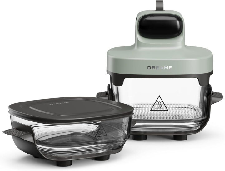 Der Dreame Tasti Glass Air Fryer steht für eine Heißluftfritteuse, deren Behälter auch als Lunchbox mit geringem Gewicht dienen kann – dank Borosilikatglas. Dabei könnt ihr zwischen zwei Glascontainern mit 2,5 bzw. 4,5 Litern Volumen wechseln. Ein farbverändernder Aufkleber auf dem Glas zeigt an, wenn das Gerät heiß wird.