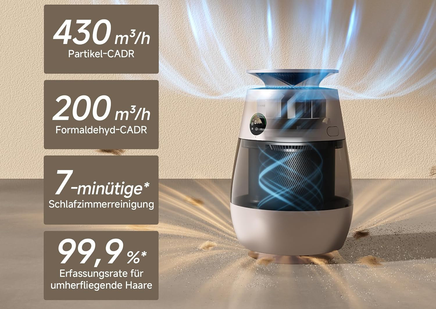 Bleiben wir zunächst mal beim Dreame Pet Air Purifier AP10. Der soll lau dem Hersteller in der Luft umher schwebende Tierhaare mit einer Effizienz von 99,9 % entfernen. Er reinigt die Luft aber grundsätzlich auch von anderen Partikeln und Schadstoffen. Dreame nennt einen Partikel-CADR von 430 m³/h und einen Formaldehyd-CADR von 200 m³/h. Das erreicht man über die Kombination aus einem Primärfilter gegen Tierhaare und grobe Partikel sowie einem Hochleistungs-Kompositfilter für Feinstaub (PM2.5). Auch an Bord ist ein doppellagiger Aktivkohlefilter gegen Tiergerüche. UVC-Licht desinfiziert, während negativ geladene Ionen den Feinstaub binden und Gerüche neutralisieren sollen.