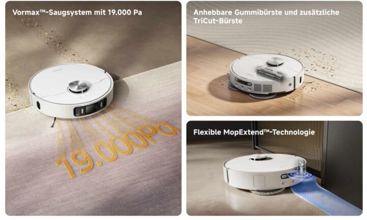 Dabei bietet der Dreame L40 Ultra AE zwei Bürsten – eine anhebbare Gummibürste und eine sogenannte „TriCut Bürste 3.0“, die vor allem für Haushalte mit Haustieren geeignet sein soll. Sie nutzt nämlich ein integriertes Messer, um Haarverwicklungen direkt vorzubeugen. Die Selbstreinigungsstation ermöglicht es dabei, nach dem Wischen die Mopps mit 75° heißem Wasser zu reinigen, was in dieser Preisklasse ein Alleinstellungsmerkmal sein sollte. Zumal Dreame auch hier auf ausfahrbare Mopps setzt, sodass Ecken und Raumränder gründlicher gewischt werden sollen.