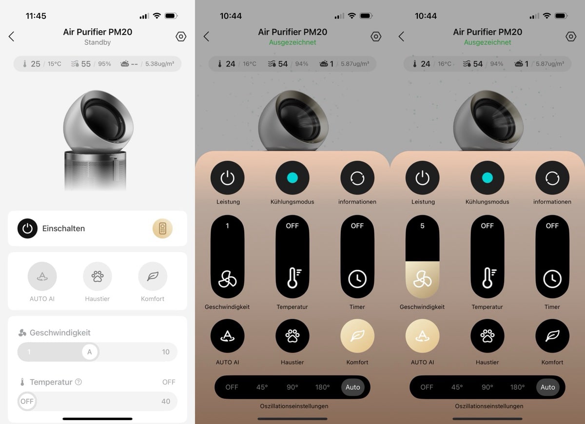 Grundsätzlich erinnert der Dreame PM20 optisch etwas an den Dyson Purifier Big+Quiet Formaldehyde. Dreame setzt auf einen soliden, gut verbauten Unterbau, der den Filter beherbergt. Oben hat man mittig die Anzeige mit dem und eben den Ausgang für die frische Luft. Gesteuert werden kann per Fernbedienung oder per App. Die App selbst bietet einen flotten Überblick über alles, was relevant sein kann. Damit ihr euch einen Eindruck machen könnt, hier einmal ein Überblick über einige der App-Punkte: