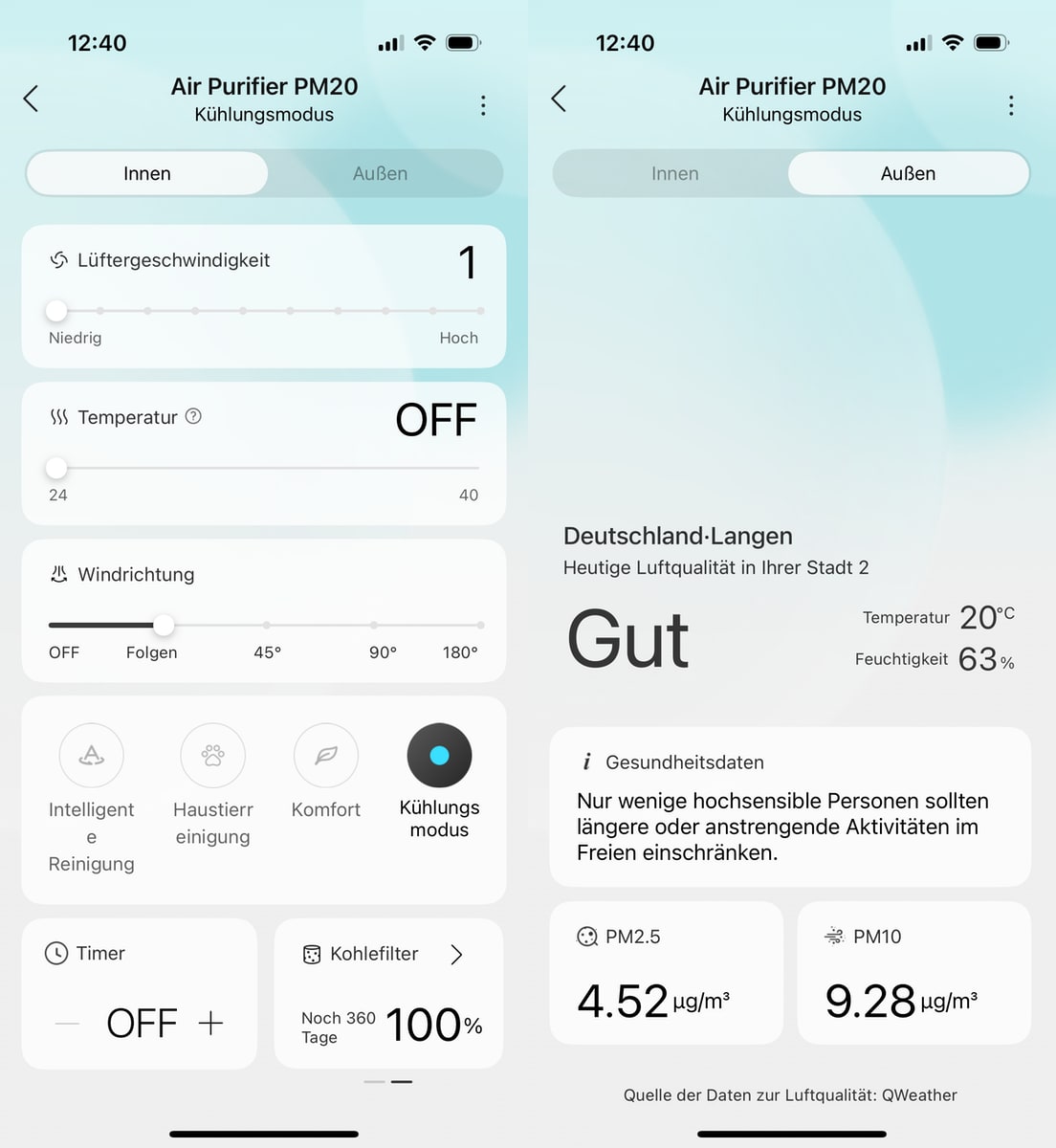 Die Luftverteilung erfolgt über das sogenannte „Dual Airway Circulation“-System. Dieses verteilt die gereinigte Luft in einem 120-Grad-Winkel nach oben und vorne. Die Technik kombiniert vertikale Zirkulation mit horizontaler Jet-Strömung. Der PM20 erreicht einen CADR-Wert von 400 m³/h und reinigt Räume bis 48 m². Sein kleiner Bruder PM10 schafft 300 m³/h und ist für Flächen bis 36 m² konzipiert. Falls unbekannt: Die Clean Air Delivery Rate (Reinluftabgaberate) und ist ein Maß für die Effizienz eines Luftreinigers. Weiß ich auch erst, seit unser Sohn seine Pollenallergie hat.