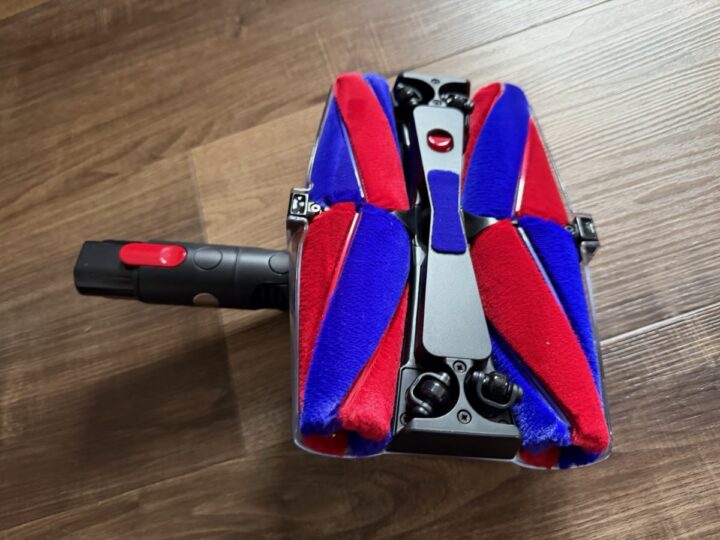 Die Fluffycones-Bodendüse ist genau wie beim V16 Piston das Herzstück. Vier konische Bürsten, die in verschiedene Richtungen rotieren und so einen „schwebenden“ Effekt erzeugen. Das macht den Sauger unter Möbeln, um Stuhlbeine oder an Fußleisten entlang extrem wendig. Die Bürsten reichen bis zum Rand, sodass kein Staub liegen bleibt. Die integrierten Laser zeigen hier in beide Richtungen und machen selbst feinen Staub sichtbar, ähnlich wie bei den größeren Dyson-Modellen. Die Düse hat leider genau wie beim Piston eine Macke. Die konische Form der Düse macht es nicht möglich, gerade gegen Fußleisten etc. zu fahren. Man muss immer angeschrägt anfahren, um wirklich alles zu erwischen. Das ist meiner Meinung nach nicht wirklich durchdacht und hatte ich auch schon beim V16 kritisiert.