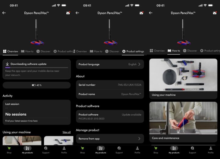Bevor es losgeht, möchte der Staubsauger noch mit der App verbunden werden. Die liefert aber kaum Vorteile. Man kann dort Softwareupdates machen, Bedienungsanleitungen lesen, mehr Informationen zur Wartung bekommen und sieht auch die Laufzeit des letzten Saugvorgangs. Aber zu mehr braucht man das nicht. Dyson folgt hier dem Trend, dass alles eine App haben muss. Für mich eher zusätzlicher Overhead, ohne den echten Mehrwert.