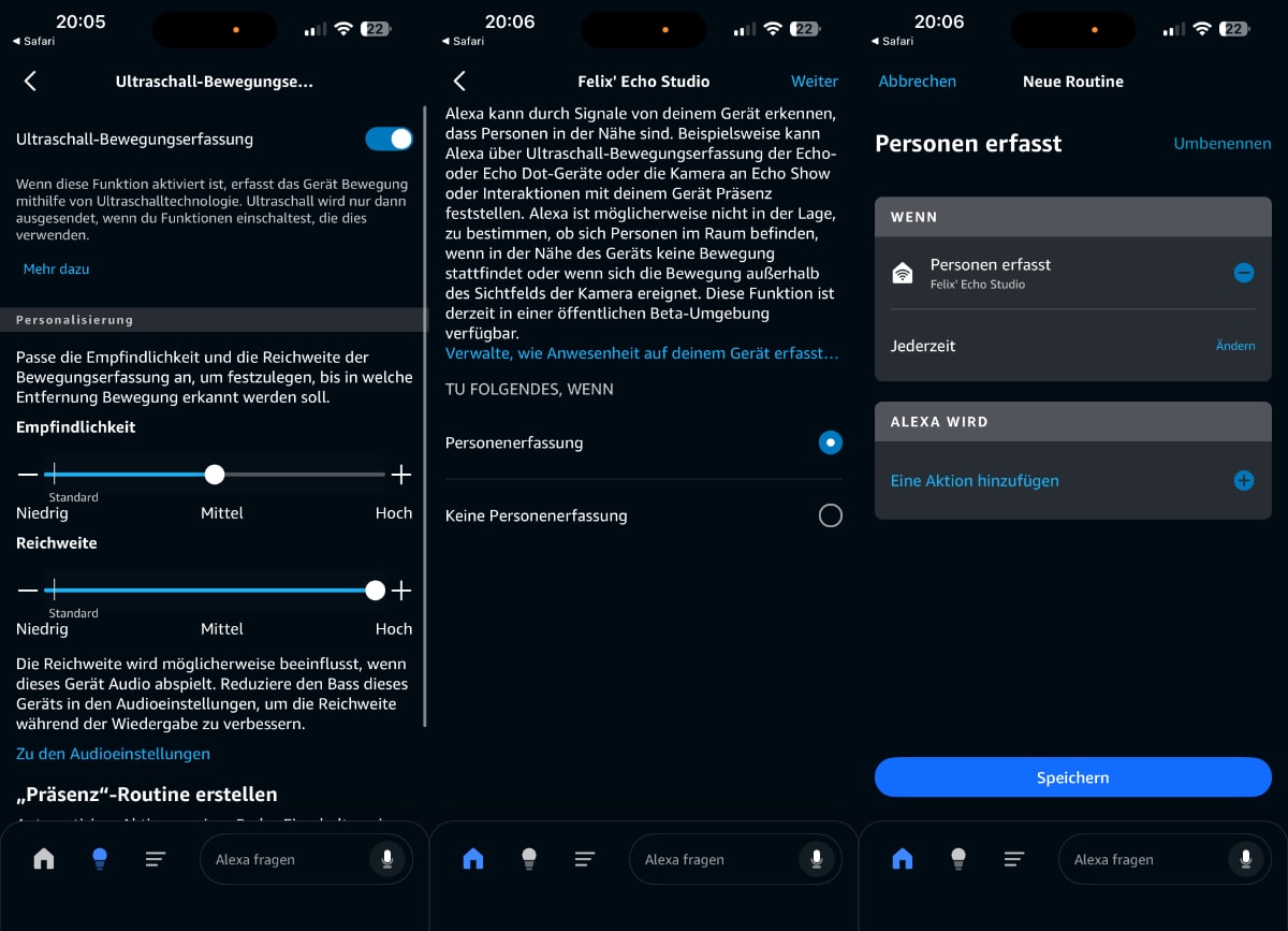Ansonsten? Der Echo unterstützt sämtliche bekannten Alexa-Funktionen der Smart Speaker. Das reicht von einfachen Fragen und der Smart-Home-Steuerung bis hin zu Anruffähigkeiten. Der Echo Studio reagiert schnell und zuverlässig auf das Wake Word, auch bei etwas lauterer Musikwiedergabe und auch die sonstige Verarbeitungsgeschwindigkeit ist top.