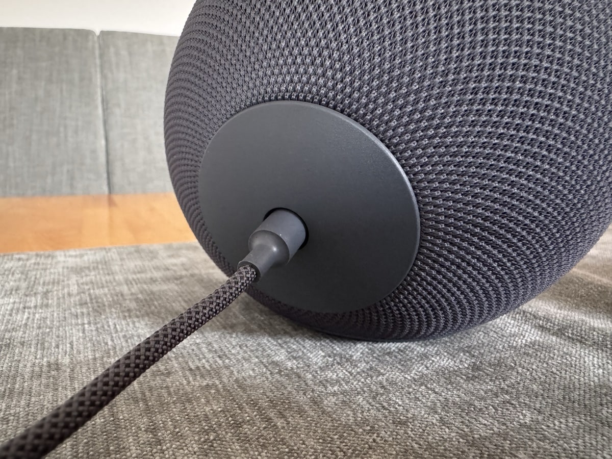 In Sachen Haptik kann man mit dem neuen Echo Studio wirklich punkten: Das 3D-Gewebe fasst sich toll an und macht einen wesentlich wertigeren Eindruck als der Stoffüberzug beim Echo der vierten Generation. Erinnert ein wenig an das Gewebe, was Apple beim HomePod Mini verwendet. Amazon setzt auch auf ein ordentliches, Stoff ummanteltes Kabel.