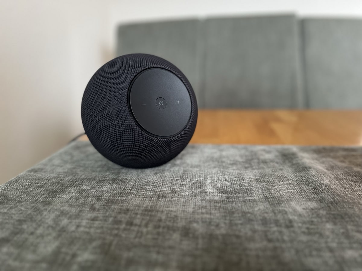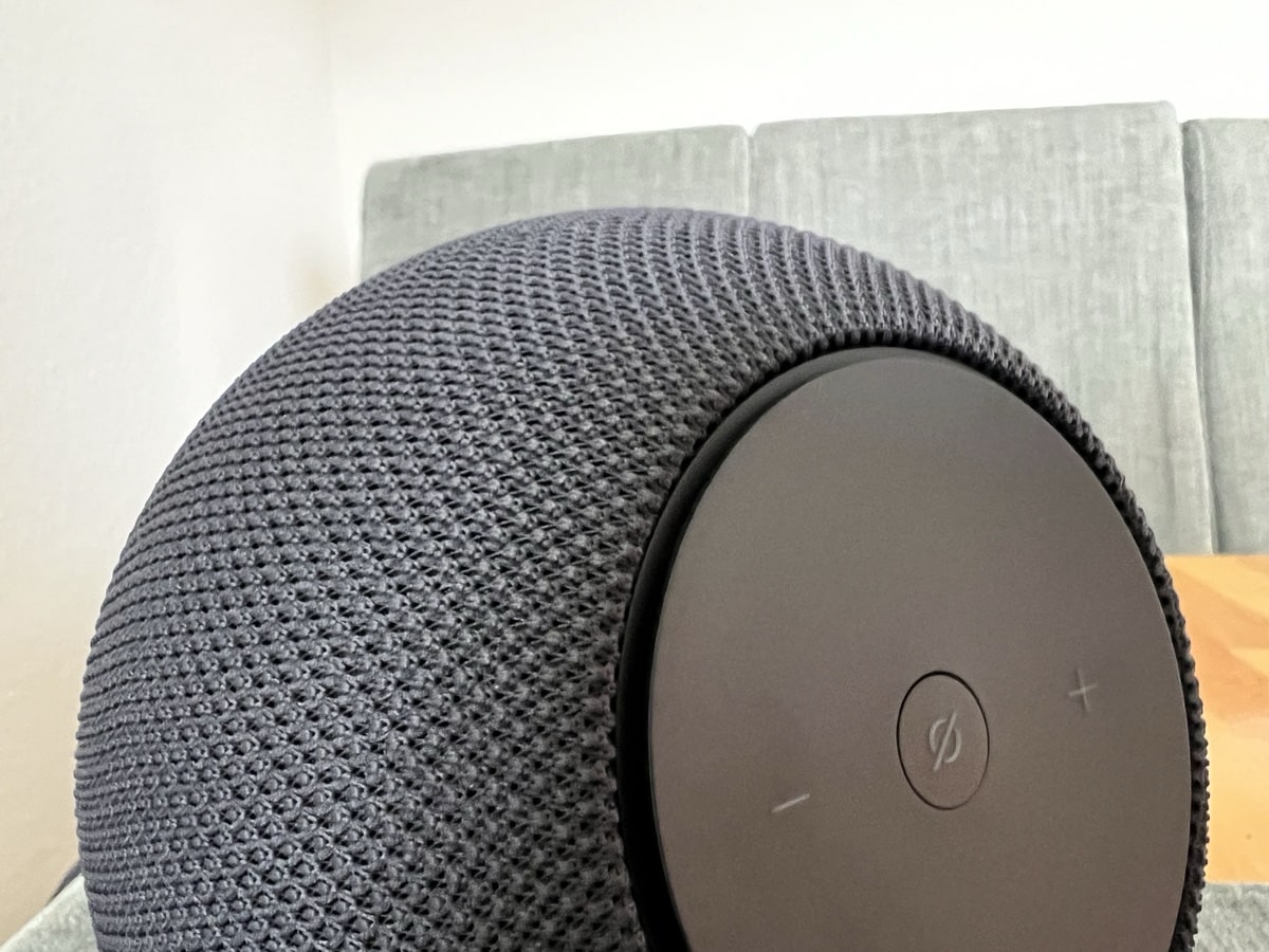 Es gibt drei Tasten: Lauter, leiser sowie eine Taste, um das Mikrofon und somit das Zuhören abzuschalten. Das Klick-Gefühl ist in Ordnung, passt aber nicht zum sonstigen Premium-Feeling. Durch das Antippen der Oberfläche lassen sich beispielsweise Timer beenden oder Wecker in den Schlummer-Modus versetzen. Diese Funktion ist optional und es kann auf Wunsch auch ermöglicht werden, dass Omnisense durch Klopfen auf die Oberseite auch die Musikwiedergabe pausiert bzw. fortsetzt. Funktioniert, an dieser Stelle bereits erwähnt, zuverlässig und komfortabel.