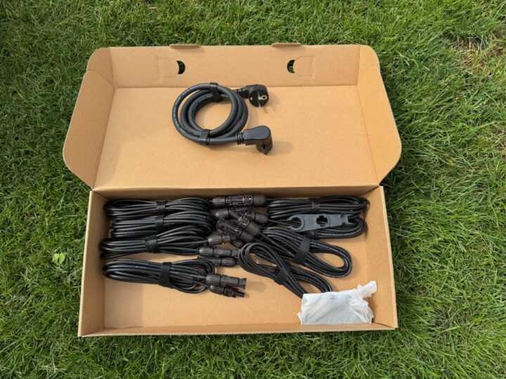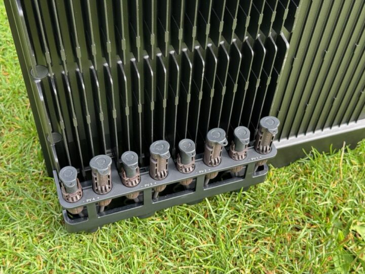 Anschlüsse hat die Box natürlich auch. Bis zu vier 500-W-Panels könnt ihr an das Teil hängen. Obendrauf sind noch zwei AC-Steckdosen verbaut, der Anschluss zum Verbinden mit dem Hausnetz und ein Kopplungsanschluss mit anderen Einheiten.