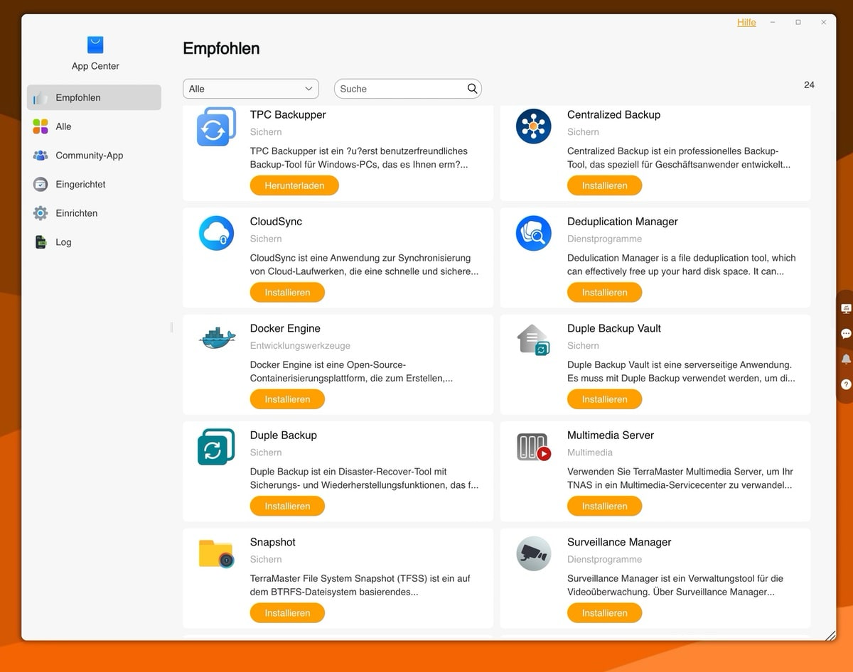 Neben den Apps gibt es die klassischen Verwaltungsmöglichkeiten, Snapshots (btrfs), Benutzer, freigegebene Ordner, Remote-Ordner, VPN-Server, Web-Server, DDNS, USB-Copy und und und. Ebenso hat man ab Werk Plex, Emby, Jellyfin, eine Foto-App sowie eine Cloud-Sync-App im Angebot. Alternativ bietet man auch ein paar Community-Apps an. Schwer zu beschreiben, grundsätzlich läuft alles, wirkt aber an manchen Stellen nicht so poliert wie bei den Großen. Dennoch ist natürlich alles an Bord, TerraMaster ist ja auch kein ganz neuer Player auf dem Markt. Hier einmal eine Screenshot-Übersicht, TerraMaster bietet eigentlich auch eine Onlinedemo zu TOS 6 an, aber die ist irgendwie nie erreichbar.