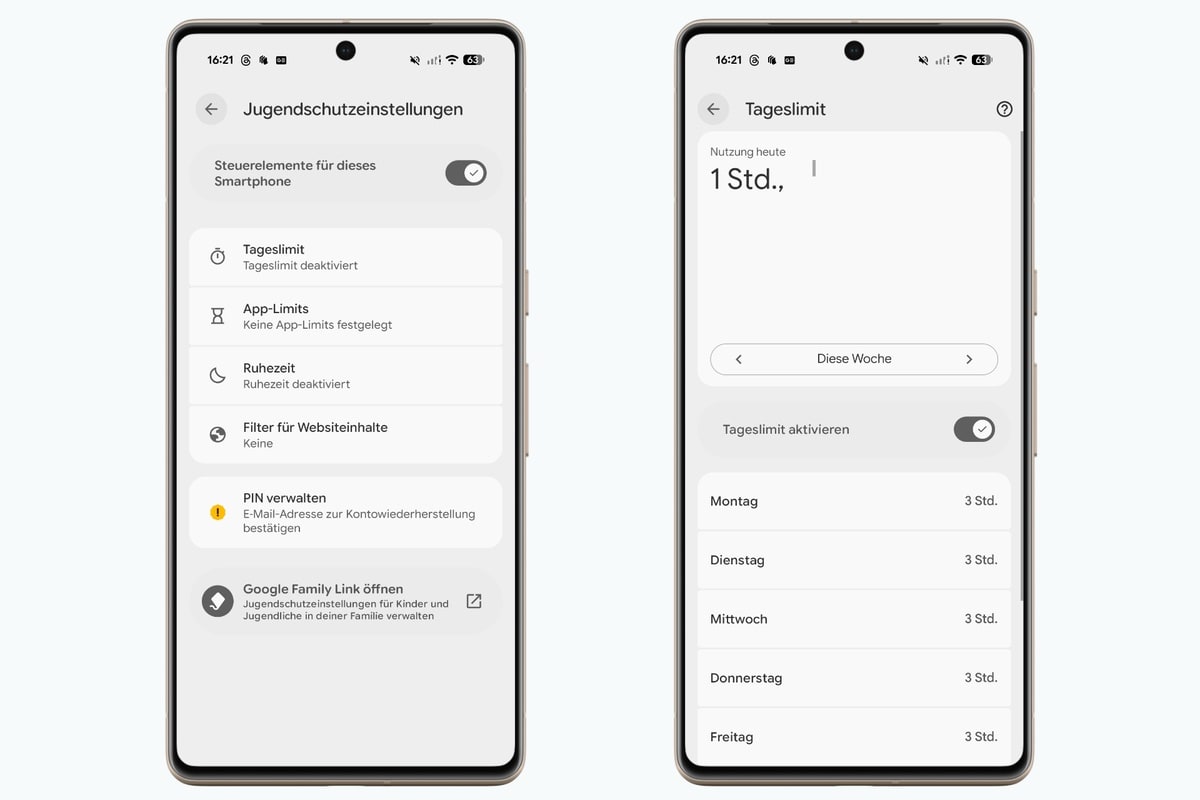 Die integrierten Kontrollfunktionen lassen sich durch eine PIN absichern und bieten grundlegende Möglichkeiten zur Einschränkung der Gerätenutzung. Eltern können die tägliche Bildschirmzeit begrenzen und Ruhezeiten definieren, etwa für die Nachtruhe. Auch einzelne Apps lassen sich zeitlich einschränken oder komplett sperren.