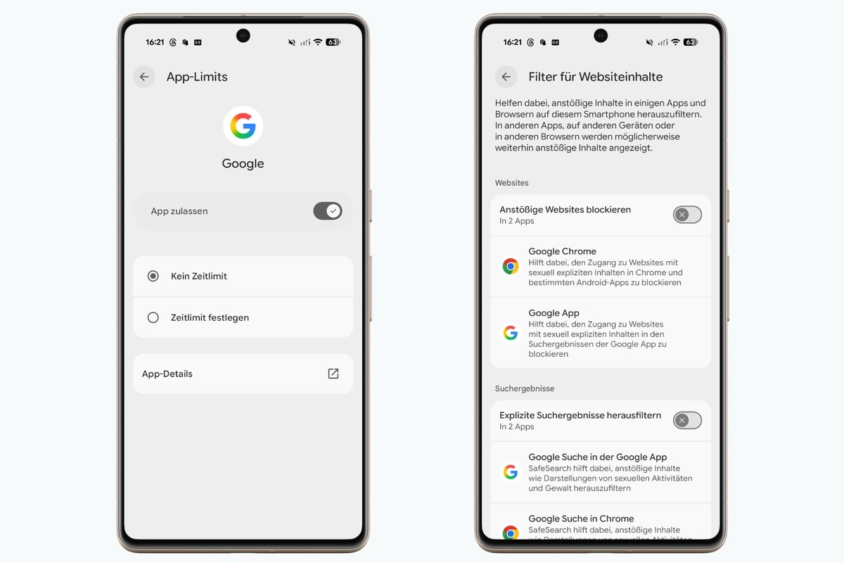 Ein Inhaltefilter schützt bei der Nutzung von Google Chrome und der Google-Suche vor nicht altersgerechten Inhalten. Wichtig zu wissen ist, dass ihr mit den integrierten Einstellungen nicht die Justierung der Kinderkonten vornehmt, stattdessen ist das lediglich eine Steuerung für das Gerät, welches ihr in der Hand haltet. Ihr könnt also quasi auch euch damit reglementieren.