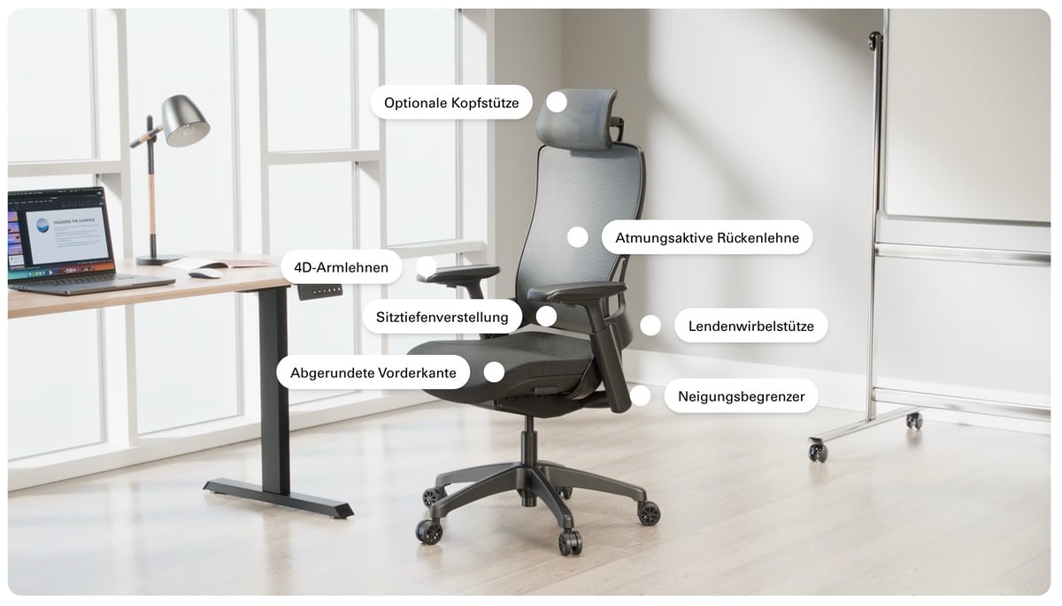 Der neue Stuhl kommt mit allem, was man von einem vernünftigen Bürostuhl erwarten kann. Die Rückenlehne besteht aus atmungsaktivem Mesh-Material, die Sitzfläche ist laut Herstellern angenehm gepolstert und vorne abgerundet. Mit an Bord sind diverse Einstellmöglichkeiten: Sitzhöhe und -tiefe lassen sich anpassen, die Lordosenstütze ist verstellbar und die Armlehnen können in vier Richtungen verstellt werden.