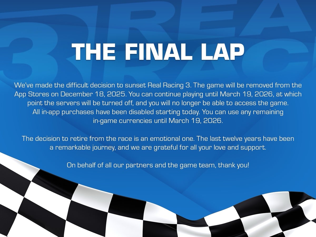 Damit endet eine Ära, die 2013 begann, als der Titel als Free-to-Play-Spiel mit optionalen Käufen auf den Markt kam. Als kleines Abschiedsgeschenk verteilen die Entwickler noch einmal 1000 Gold sowie einen Audi S1 e-tron Quattro und einen Rimac Nevera (2023) an die verbliebenen Spieler. Die Server bleiben noch eine Weile am Netz, das endgültige Aus ist für den 19. März 2026 terminiert. Ab diesem Zeitpunkt ist dann auch Schluss mit dem Zugriff auf Inhalte oder getätigte Käufe, da das Spiel ohne Serveranbindung nicht mehr funktioniert.