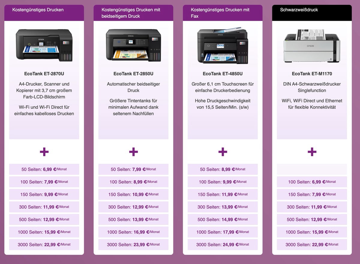 Die Besonderheit des Angebots liegt in der Kombination aus Hardware-Leasing und Verbrauchsmaterial. Epson positioniert sich damit als wohl erster Hersteller im deutschen Markt, der Privatkunden ein derartiges Komplettpaket ohne zusätzliche Aktivierungsgebühr anbietet. Zur Auswahl stehen aktuell sechs verschiedene EcoTank-Modelle, vom Einsteiger ET-2870U bis zum professionellen A3-Drucker ET-16650U. Die Druckvolumina können flexibel zwischen 50 und 3000 Seiten pro Monat gewählt werden.