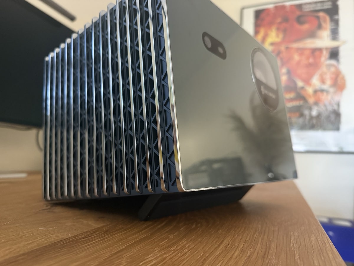 Das Gerät präsentiert sich in einem, meines Erachtens, hochwertigen Gehäuse mit 14 galvanisierten Metallstreifen und Glasoberflächen. Mit Abmessungen von 25,9 x 18,5 x 21,6 cm und einem Gewicht von 7 kg ist der Projektor zwar transportabel, aber eher für die feste Installation gedacht. Die Verarbeitungsqualität zeigt sich auch in der robusten Konstruktion, die laut Hersteller einer Belastung von bis zu 100 kg standhält. Sieht retro aus, hat aber moderne Technik unter der Haube. Mag ich sehr.