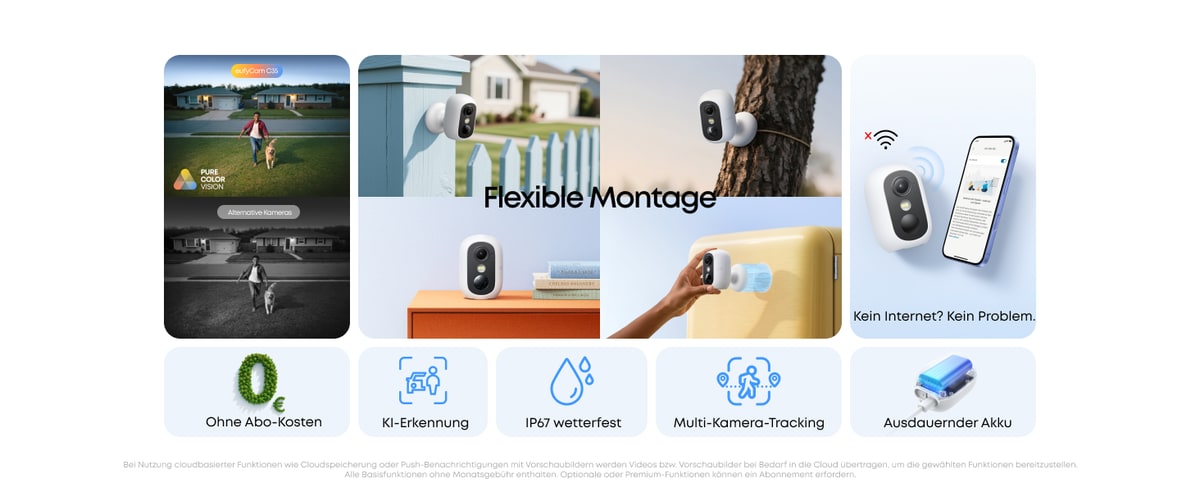 Der integrierte Lithium-Ionen-Akku soll eine Laufzeit von etwa 3 Monaten erreichen. Das Aufladen erfolgt über USB-C mit 10 Watt und dauert rund 8 Stunden. Eufy setzt auf eine KI-gestützte Erkennung von Gesichtern, Personen, Fahrzeugen und Haustieren. Kamera-Aufnahmen lassen sich lokal auf einer microSD-Karte mit bis zu 128 GB ablegen, auch die HomeBase Mini ist kompatibel. Für die Nachtsicht ist die C35 mit einem Scheinwerfer ausgestattet, welches Farbaufnahmen bei Dunkelheit ermöglicht. Die integrierte Infrarot-Nachtsicht reicht bis zu 6 Meter.