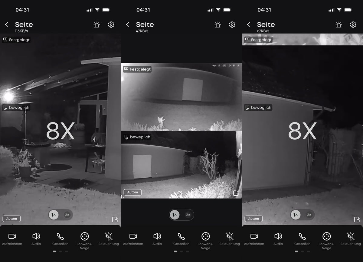 Nachts schalten sich automatisch die Scheinwerfer ein, beide Kameras haben eigene integriert. Wer das nicht möchte, kann auf Infrarot-Aufnahmen in Schwarzweiß umschalten, aber die Farbaufnahmen mit Licht sind deutlich besser.