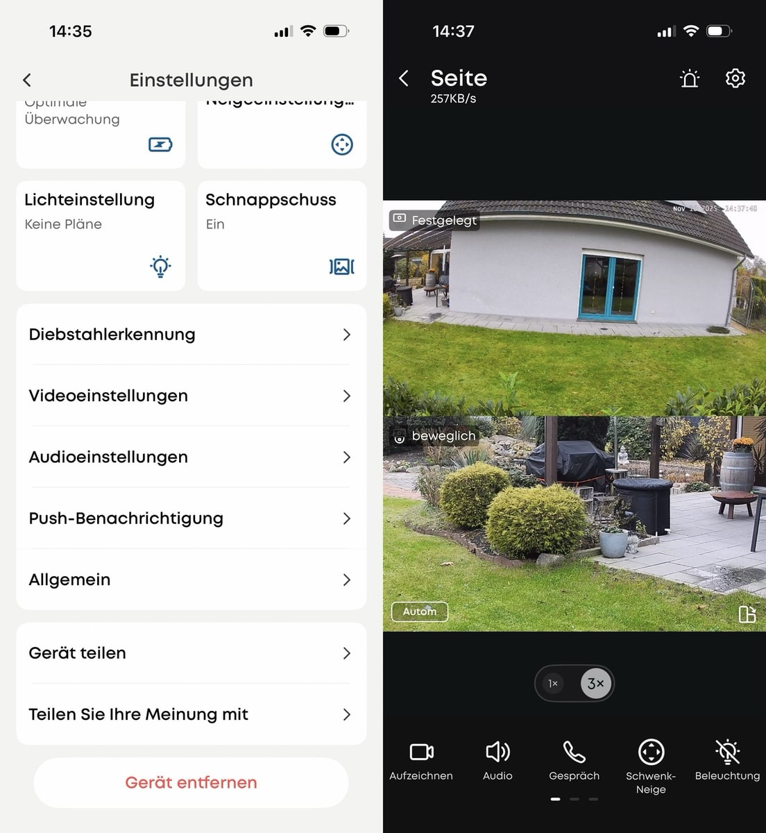 Bis zu 4K Auflösung sind möglich. Standardmäßig kombiniert das System aber beide Feeds in einem Video. Die Objekterkennung funktioniert ziemlich zuverlässig, wobei bei uns im Test nur Menschen getestet werden konnten. Das AI-Tracking ist eine feine Sache. Wird Bewegung erkannt, schwenkt die bewegliche Kamera automatisch mit und zoomt heran. Nach fünf Sekunden ohne Ziel kehrt sie zur Ausgangsposition zurück, auch wenn die App etwas anderes behauptet. Gesichtserkennung ist ebenfalls an Bord. In der Praxis reduziert das die Zahl der Fehlalarme deutlich, auch wenn es nicht perfekt ist.