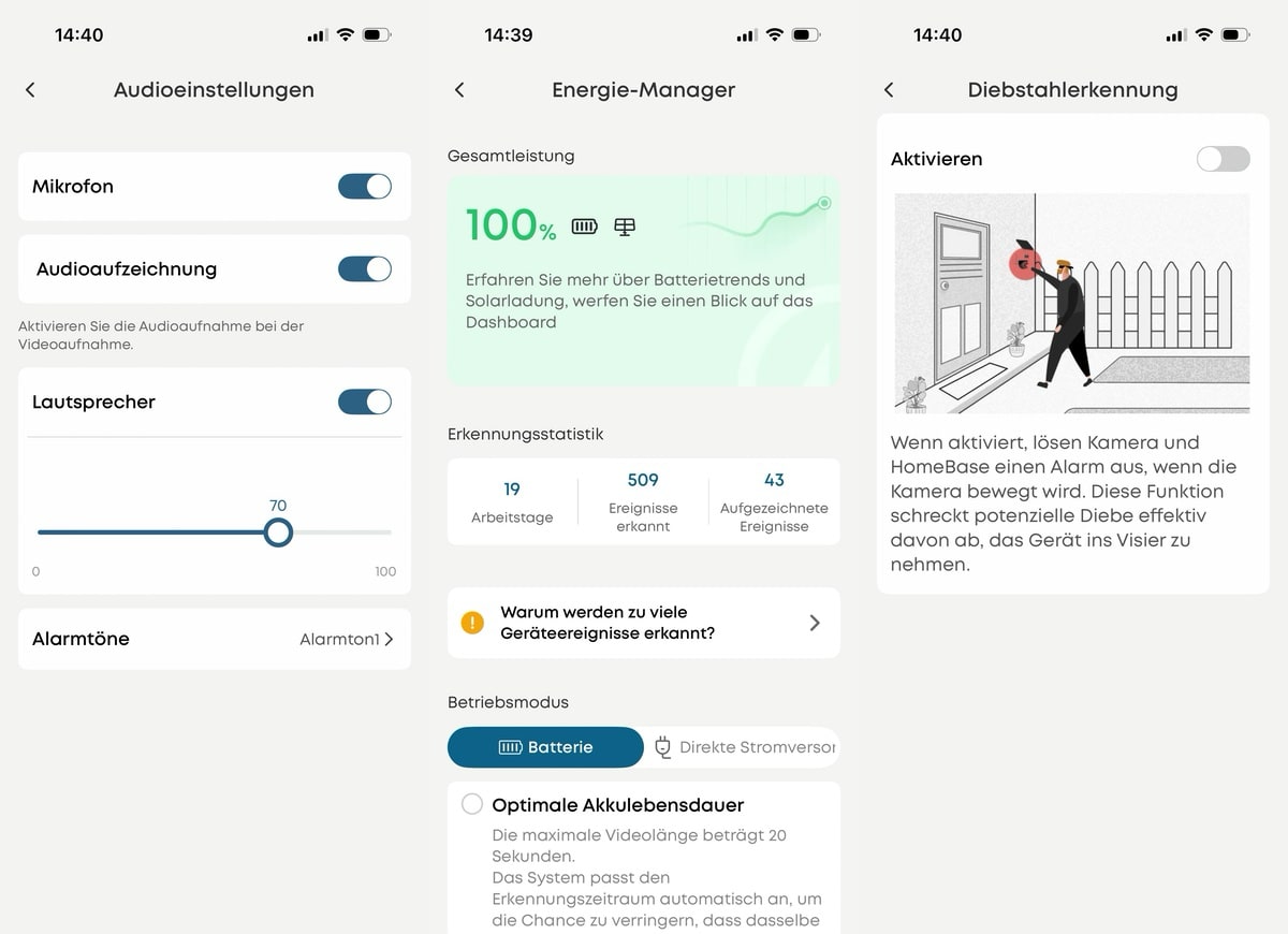 Man kann aber auch die Dauerstromversorgung wählen. Die Daueraufzeichnung bei Dauerstrom per USB-C ist zwar angekündigt, funktioniert bei meinem Modell bisher allerdings nicht (zumindest nicht in Verbindung mit der Homebase). Stattdessen lief das Ganze wie bei anderen Akku-Kameras mit bewegungsorientierter Aufnahme.