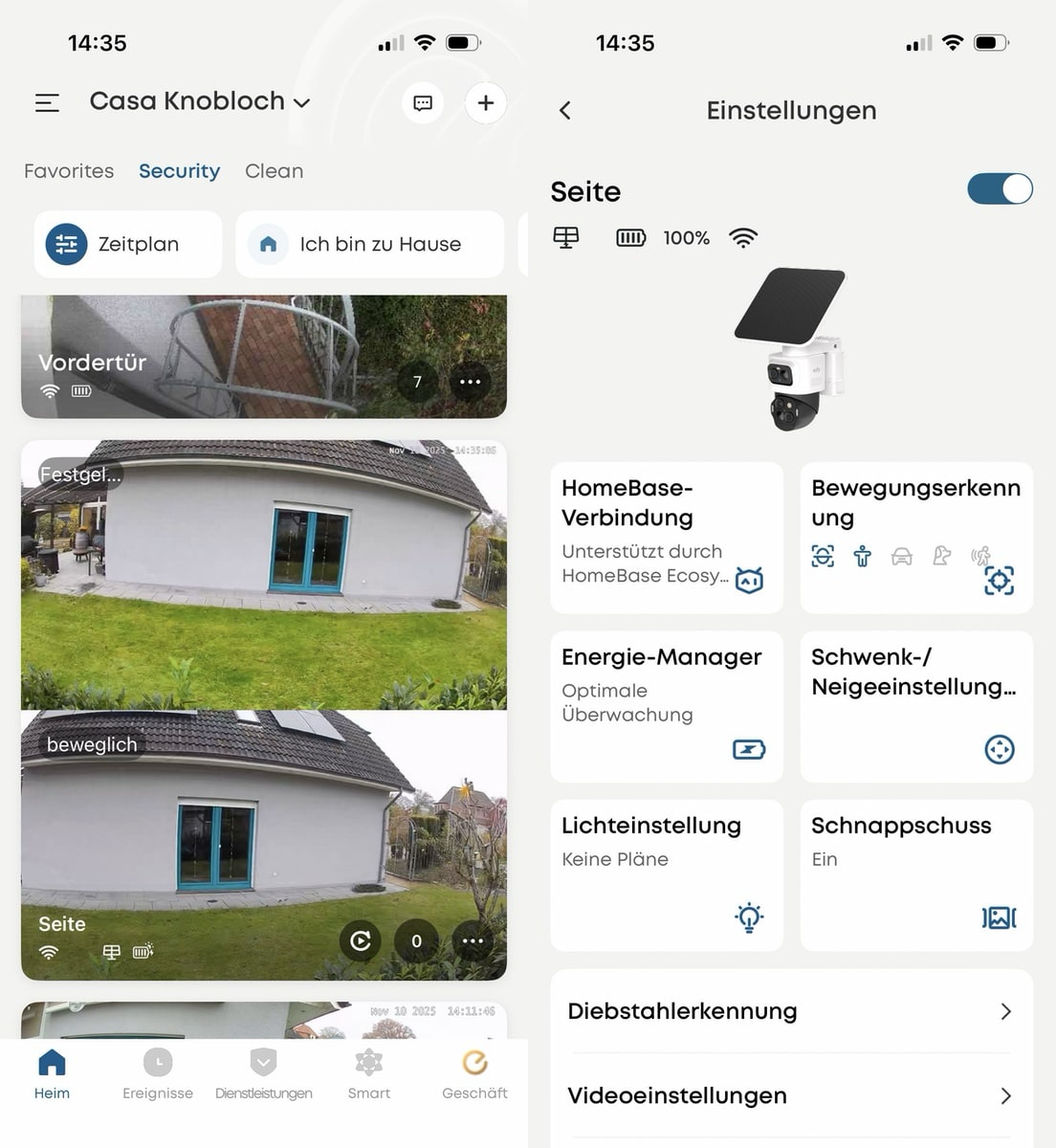 Die Aufnahmen landen auf der Homebase und lassen sich in der App nach Ereignistyp und Kamera filtern. Die Darstellung ist simpel gehalten, eine Miniaturansicht pro Tag. Bei Tageslicht liefert die fixe Kamera meines Erachtens minimal detailreichere Bilder mit etwas satteren Farben. Der Unterschied ist aber nicht dramatisch. Der Clou liegt in der Kombination: Die Weitwinkelansicht zeigt den Kontext, während die schwenkbare Kamera Details einfängt, die eine einzelne fixe Kamera verpassen würde. Das Tracking arbeitet meist sanft genug, um Bewegungsunschärfe zu vermeiden.