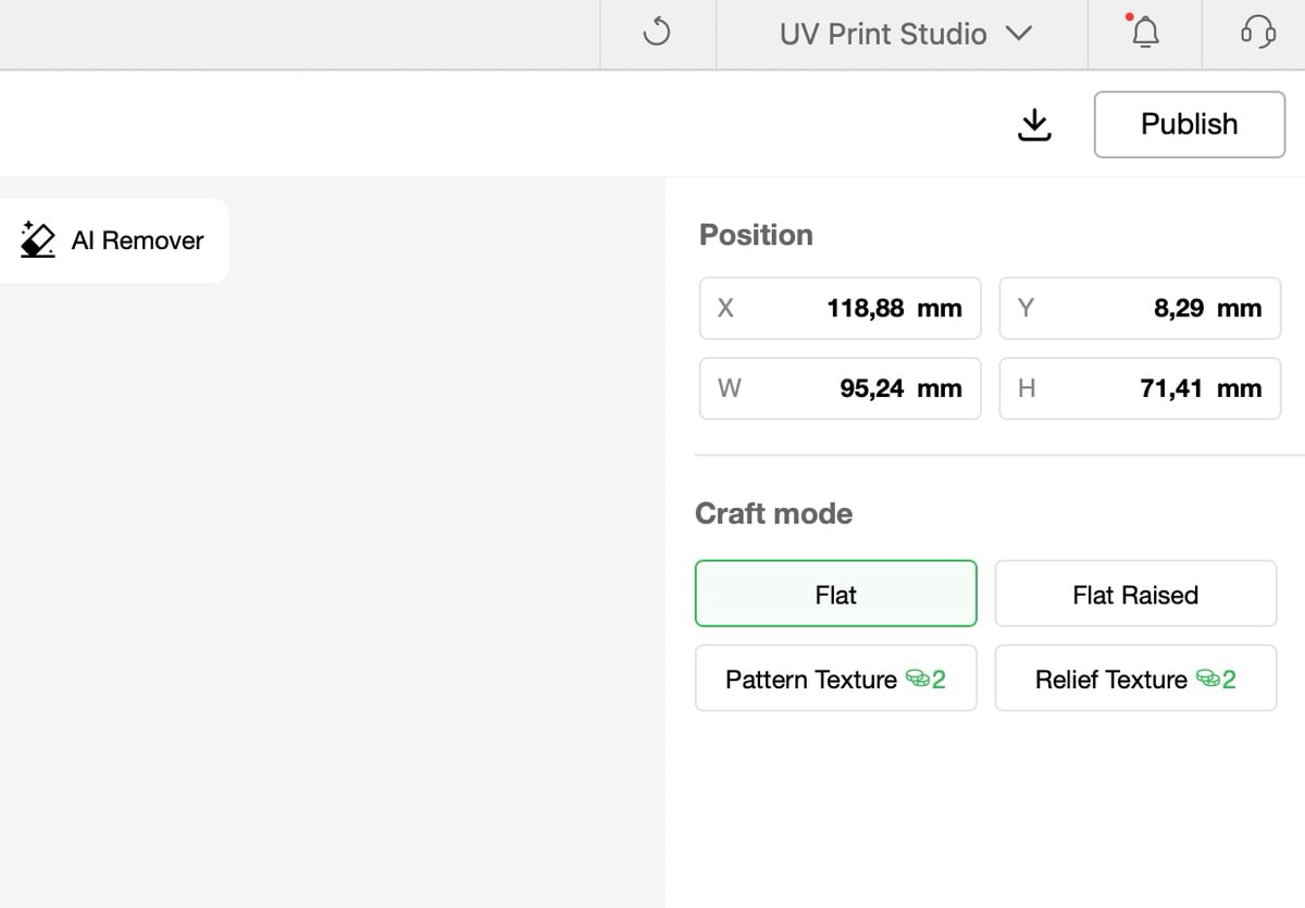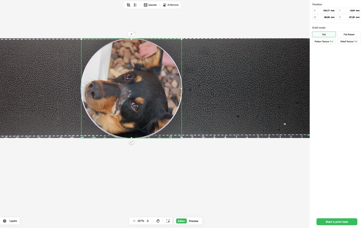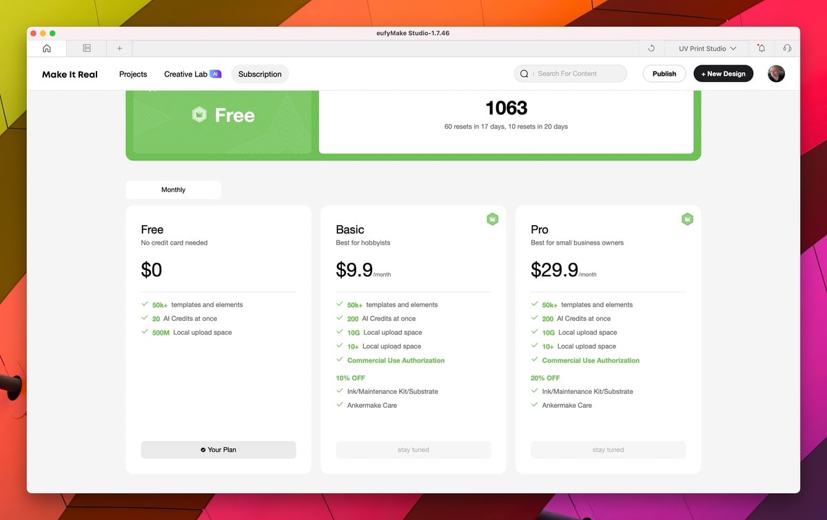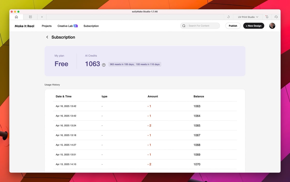 Die Bedienung erfolgt über eine Smartphone-App oder Desktop-Software, unterstützt durch eine integrierte Kamera für die präzise Positionierung der Drucke. Die Software bietet KI-gestützte Funktionen für die Erstellung von Kunstwerken und 3D-Texturen, was allerdings bei kreativen Nutzern durchaus kontrovers diskutiert werden könnte. eufyMake hat zig KI-Punkte gratis mit dabei, wer später mehr machen möchte, muss KI-Punkte kaufen. Schräges Modell, das man nicht nutzen muss. In der Software sieht das wie folgt aus_