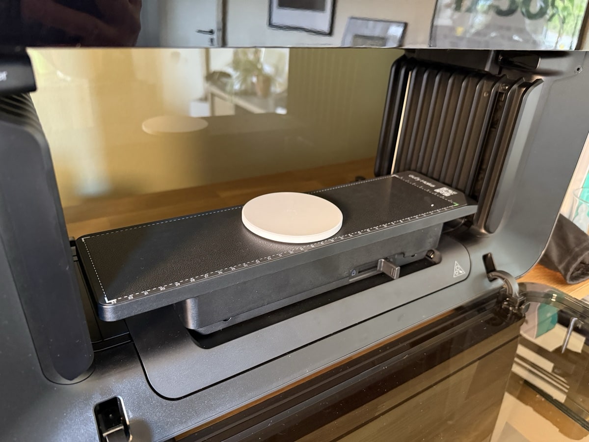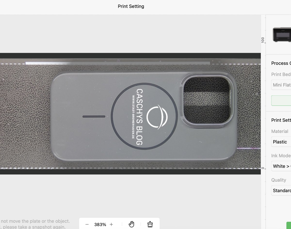 Das Tintenmanagement erfolgt über ein CMYK-System, ergänzt durch Weiß- und Glanztinte. Die 100-ml-Kartuschen kosten im Set 299 Dollar, was ein Vielfaches herkömmlicher UV-Tinten entspricht. Dieser Preisaufschlag könnte für viele Nutzer ein wichtiger Kostenfaktor sein. Schade: In der Software von eufyMake gibt es bislang keine Infos über den Verbrauch der Tinte für ein Werk, ebenso fehlt eine Tintenstandanzeige. Die Software ist eine Beta und dieser Punkt ist nicht der einzige, an dem noch geschraubt werden darf.