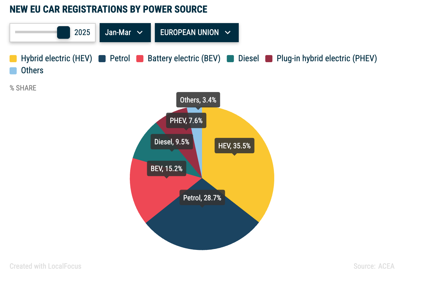 Die Neuregistrierungen von Benzinern z. B. ergab sich in Deutschland gegen Ende des 1. Quartals 2025 ein Absturz um -26,6 % gegenüber dem 1. Quartal 2024. Ein ähnliches Minus war bei Dieselfahrzeugen zu verzeichnen. Im Gesamtbild entwickelt sich der EU-Markt also durchaus weg von Verbrennern und hin zu hybriden und vollelektrischen Fahrzeugen.