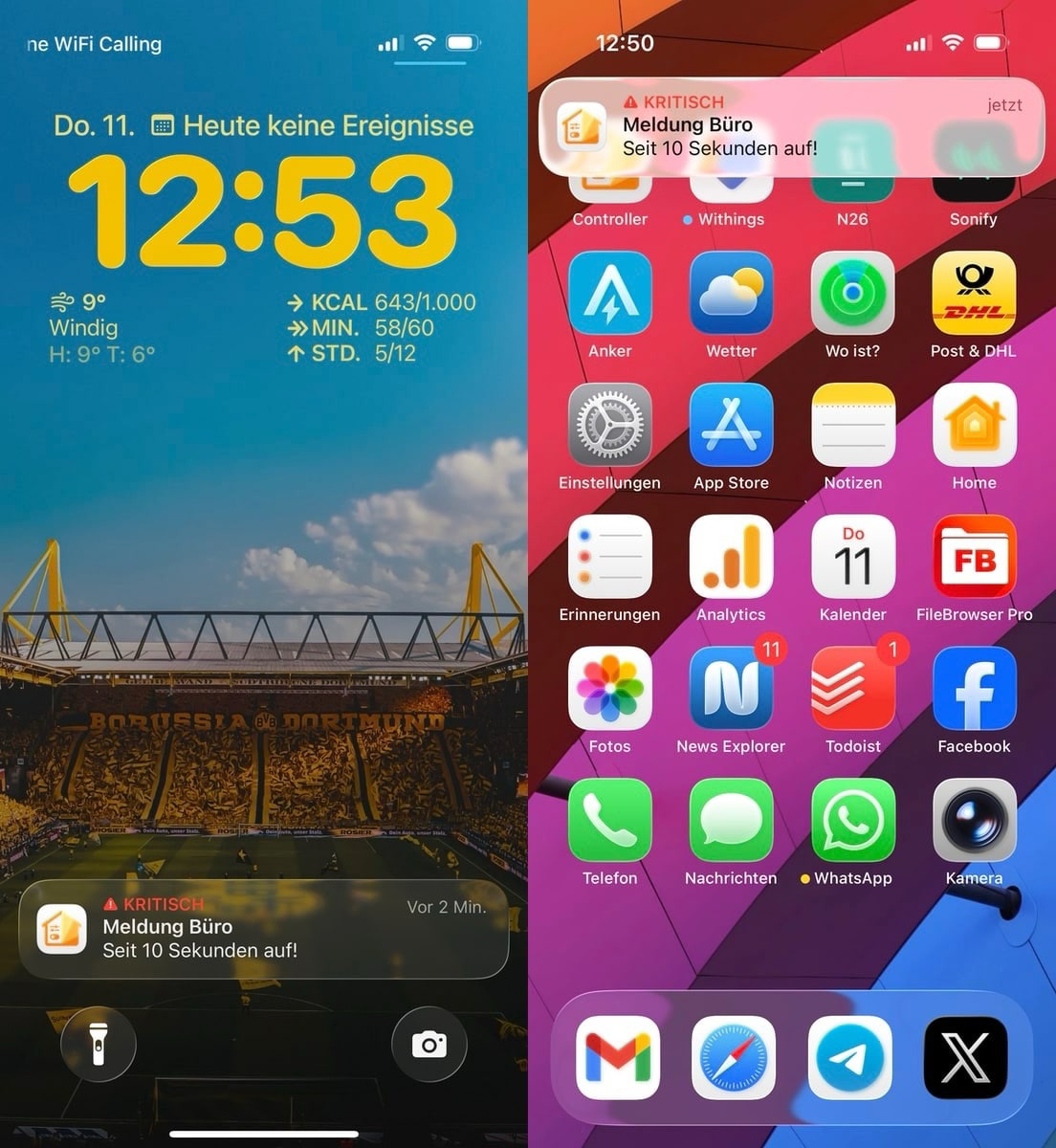 Beispielsweise die App Pushcut. Die ist kostenlos, erlaubt in der freien Variante aber nur drei Automationen. Da kann man dann mit den Apple Kurzbefehlen eine Automation bauen, die dann auf dem lokalen Gerät eine Benachrichtigung einblendet. Auch Controller für Homekit bietet so etwas an. Die App kostet Geld, kann aber auch einiges – unter anderem jene Benachrichtigung nach x Minuten (und viel mehr). Ich habe mal eine Beschreibung für Controller für Homekit angefertigt, Pushcut arbeitet fast identisch, Stichwort Web Hook. Testweise arbeite ich mit einer Automatisierung, die eine Meldung ausgibt, wenn das Fenster 10 Sekunden auf ist. Das müsst ihr für euch anpassen. Logisch. Und stellt bitte vorher sicher, dass euer iPhone als Gerät eingerichtet ist in Controller für HomeKit.