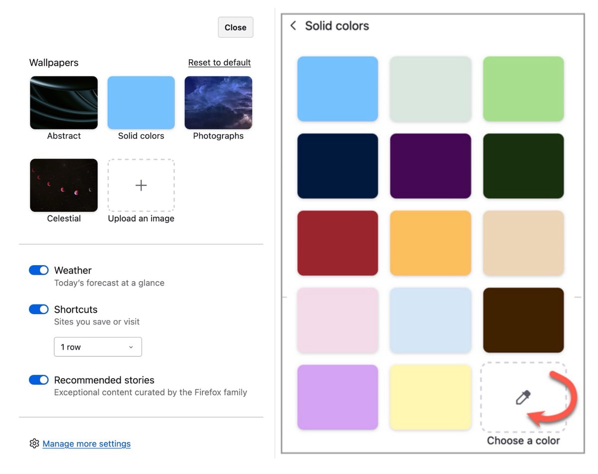 Auch erwähnenswert ist die neue Möglichkeit, den New Tab mit eigenen Hintergrundbildern oder Farben zu personalisieren. Diese Funktion wird schrittweise für neue Nutzer ausgerollt, kann aber auch sofort über Firefox Labs aktiviert werden. Mozilla hat zusätzlich neue Hintergrundbilder und eine neue „Celestial“-Kategorie hinzugefügt.