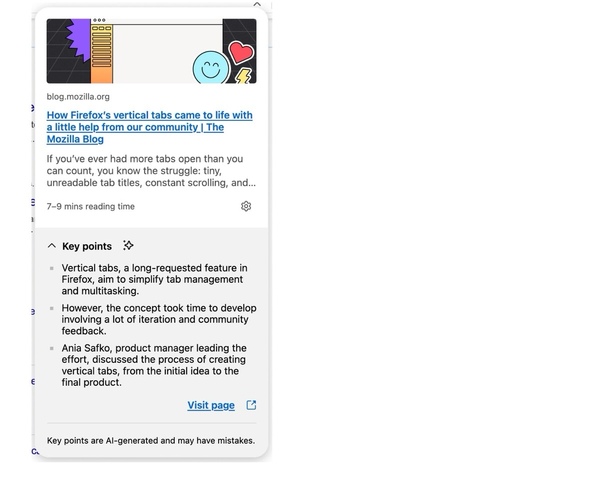 Eine experimentelle Funktion namens „Link Previews“ ermöglicht es, Vorschauen von Links anzuzeigen. Nach der Aktivierung in den Firefox-Labs-Einstellungen können Nutzer mit der Tastenkombination Alt+Shift beim Überfahren eines Links eine Vorschau anzeigen lassen.