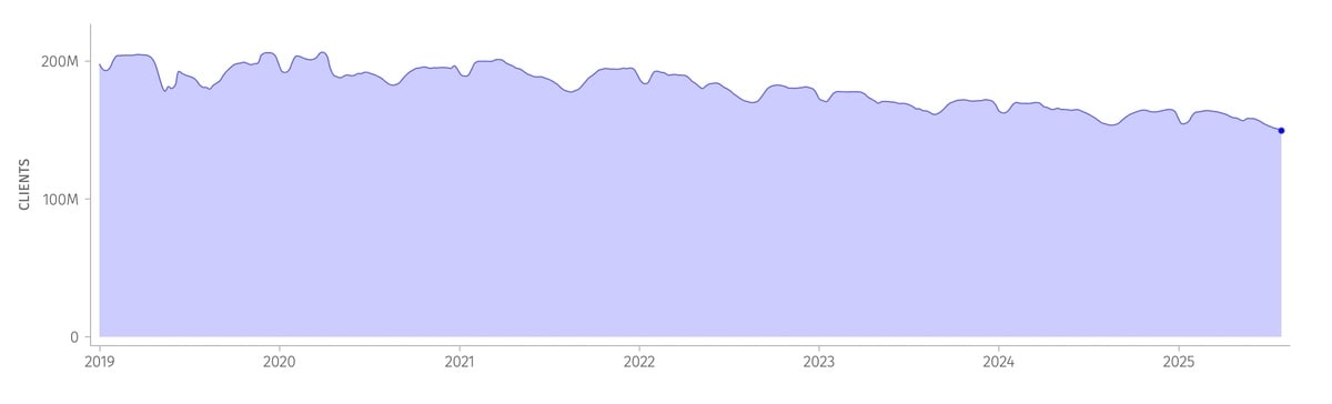 Schaut man aktuell auf die Zahlen, dann hat man global 149,63 Millionen aktive Anwender (Stand 28. Juli). Das sind die MAUs, also die monatlich aktiven Anwender. Ein historisches Tief für den Browser. Als Vergleich: 2024 waren es zum gleichen Zeitpunkt 155 Millionen, 2023 noch 164 Millionen. Und in den Jahren davor war es eben auch besser.