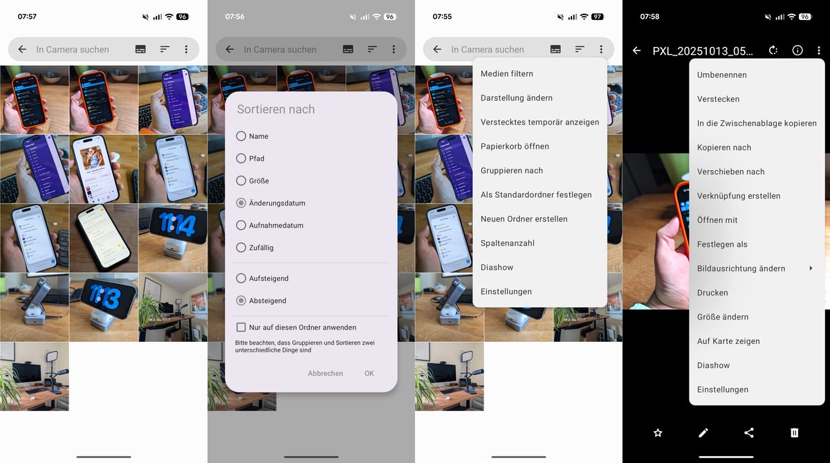 Die Benutzeroberfläche folgt dem Material Design und passt sich mit dynamischen Themes an. Wer mag, kann das Erscheinungsbild und die Funktionsbuttons nach eigenen Vorlieben anpassen. Bei den unterstützten Dateiformaten gibt es „das Übliche“ – von JPEG über PNG bis zu RAW-Formaten wird eine breite Palette abgedeckt. Auch Videos in gängigen Formaten wie MP4 oder MKV können verwaltet werden.