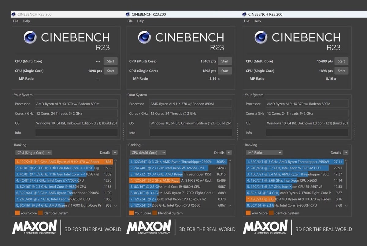 So habe ich nichts an den Einstellungen gedreht, entsprechend auch keinen dedizierten Performance-Modus eingeschaltet und ich war von der Performance durchweg begeistert. Auch rechenintensive Aufgaben und das eine oder andere Spiel sind für das kompakte Performance-Biest kein Problem. So punktet auch der verbaute AMD Ryzen AI 9 HX 370 mit seinen 12 Kernen und 24 Threads mit bis zu 5,1 GHz Taktrate, mit der Radeon 890M auf der Grafikseite auf den oberen Rängen der Benchmarkplätze – in einem kompakten Notebook wohlgemerkt. Im Single-Score-Ranking des Cinebench R23 gar Rang 1. Sowohl was die Performance im Single-Core, als auch dem Multi-Core-Benchmark angeht konnte man ordentlich punkten: