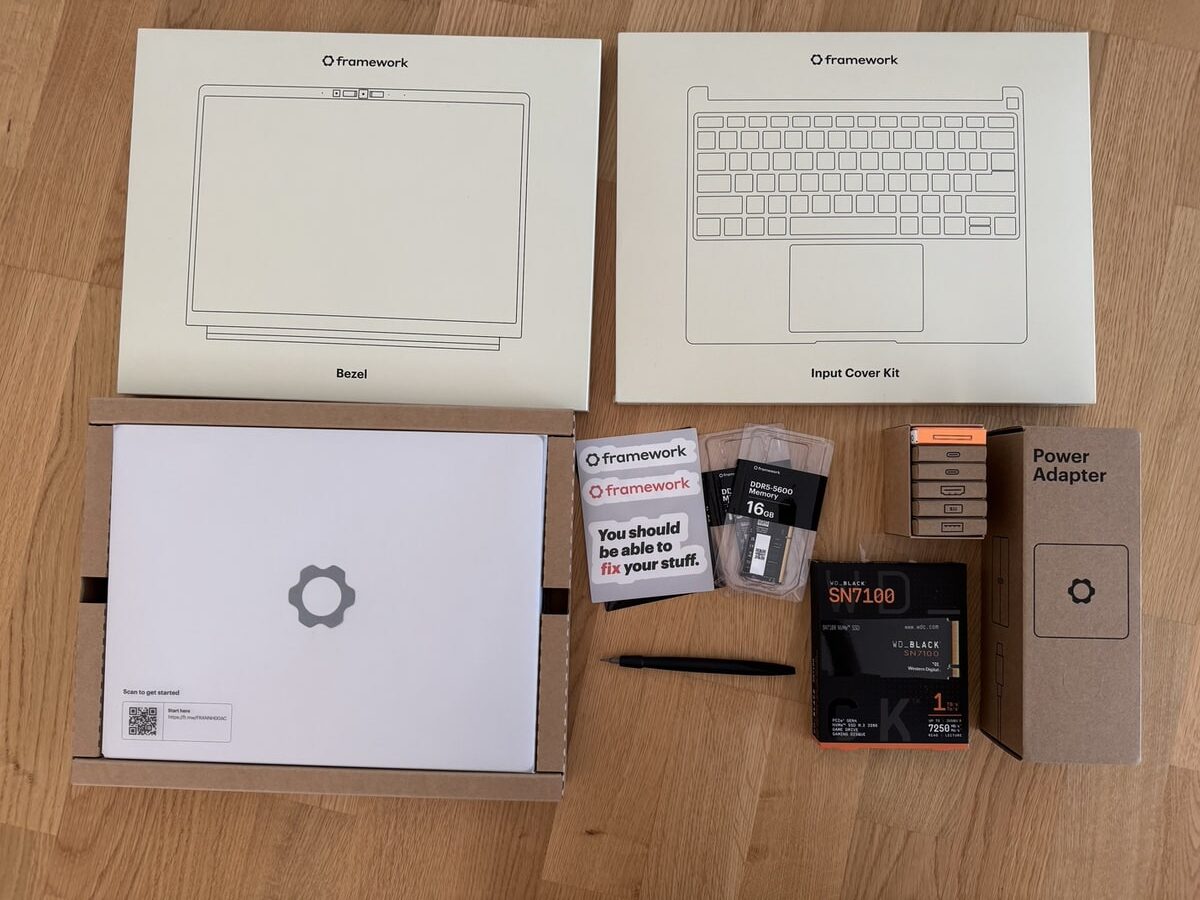 Die diversen Einzelverpackungen gaben direkt einen Vibe an Zeiten zurück, in denen ich auch mal einen PC zusammengeschraubt habe – nur eben hier im Formfaktor eines Notebooks. Framework legt seinen Geräten einen Schraubendreher bei. Der alleine genügt, um das Gerät auseinanderzunehmen und/oder zusammenzusetzen.