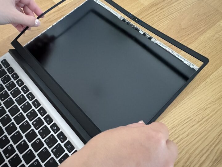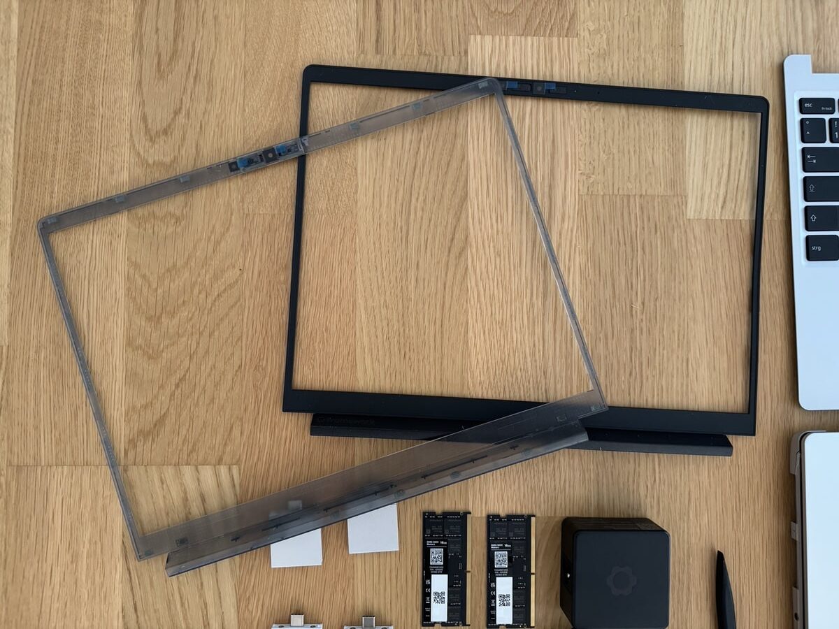 Nachdem die Arbeitsspeichermodule und die SSD an passender Stelle eingesetzt waren, hat es genügt, die Tastatur anzuklemmen und die Blende rund um das Display zu installieren sowie die Schrauben an der Rückseite vorsichtig anzuziehen. Alles in allem sehr schön aufbereitet und das Zusammenbauen ist einfacher als von so manchem Ikea-Möbelstück. Bei der Blende gibt es die Möglichkeit, zu personalisieren und beispielsweise zu einem Element mit transparenter oder farbiger Optik zu greifen.