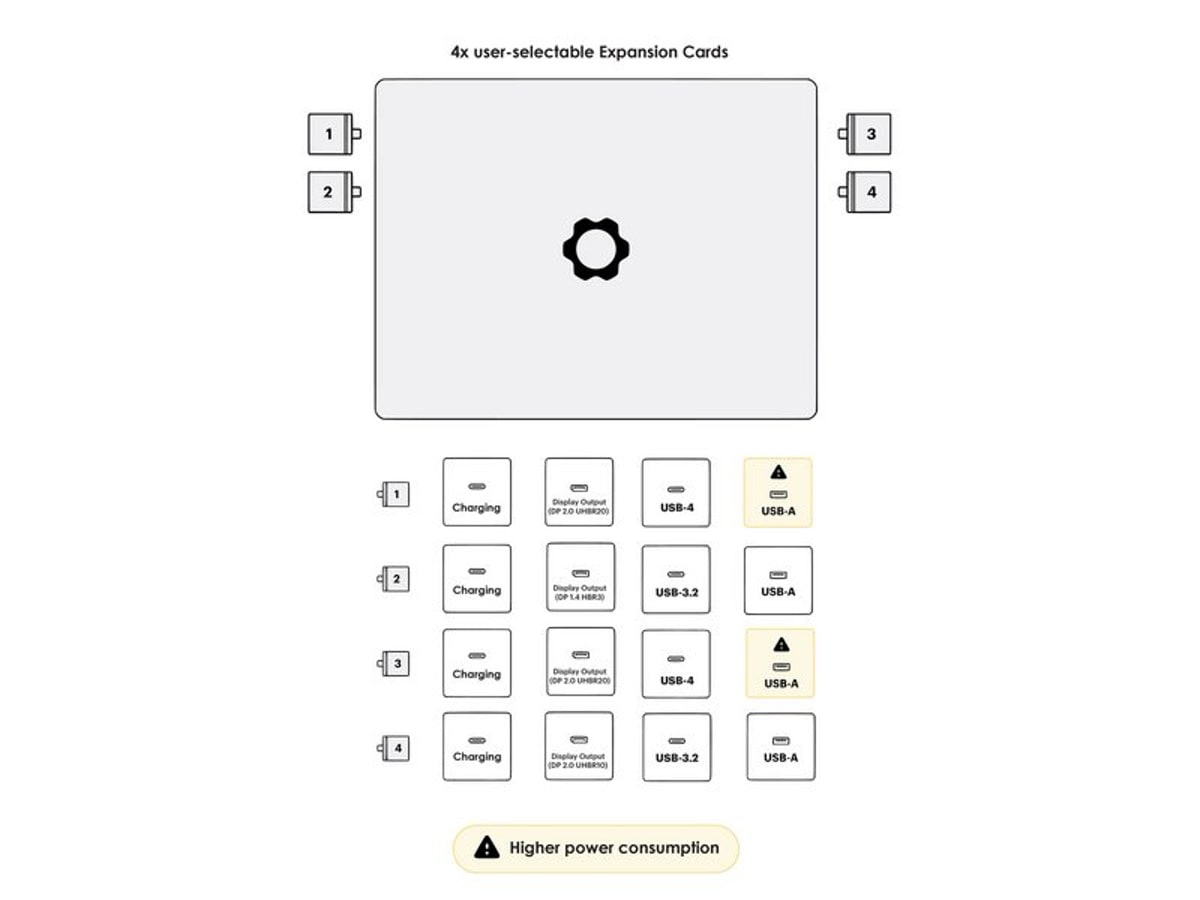 Wahnsinnig cool sind die sogenannten Expansion-Cards. Die bieten nicht nur die Möglichkeit, das Notebook an persönliche oder gar tagesaktuelle Voraussetzungen anzupassen. Auch Upgrades auf potenziell weitere Anschlüsse und Standards sind, sofern die technischen Anbindungsgegebenheiten stimmen, möglich. HDMI 2.1 gibt es beispielsweise weiterhin nicht, wenngleich (minimal kastriert auf 40 Gpbs) das technisch möglich sein müsste.