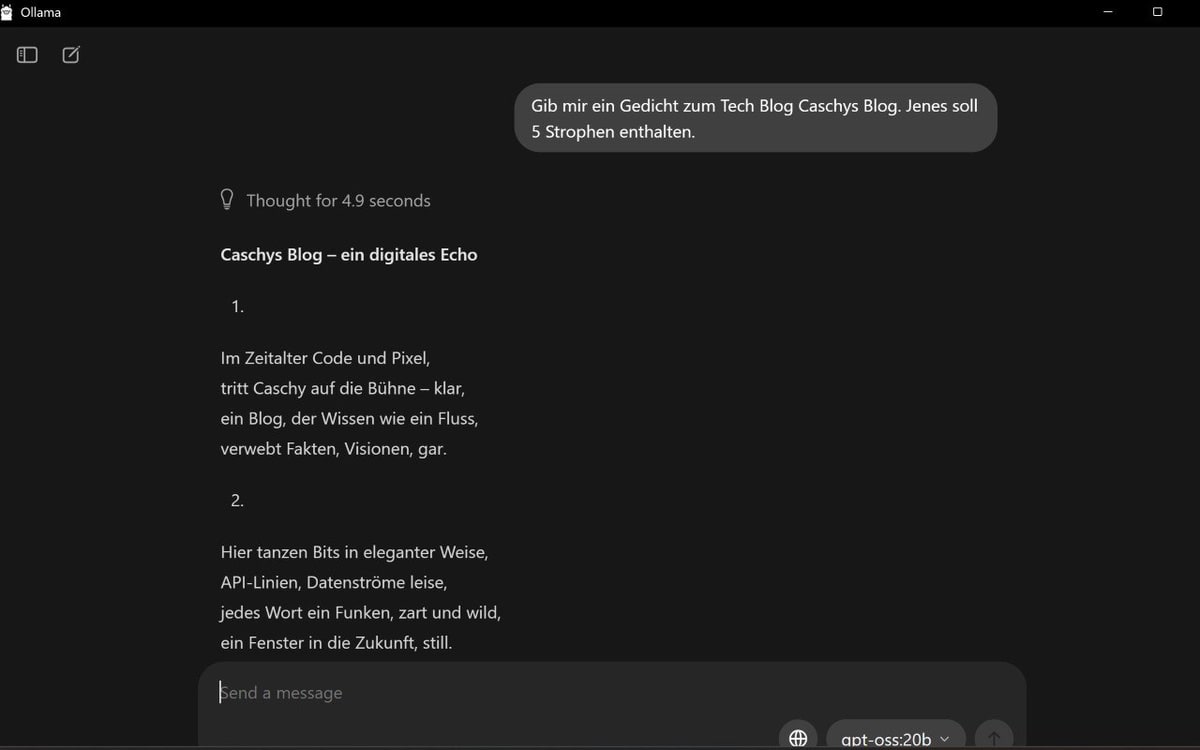 Die verbaute GPU/NPU punktet auch bei KI-Anwendungen. So lassen sich etwa problemlos auch lokale KI-Modelle ausführen. Etwa das Modell gpt-oss-20b von OpenAI, was potente und vergleichbare Ergebnisse zu OpenAIs o3 mini liefert, bekommt man teils binnen Sekunden die (mehr oder minder sinnvolle,) generierte Antwort des LLMs: