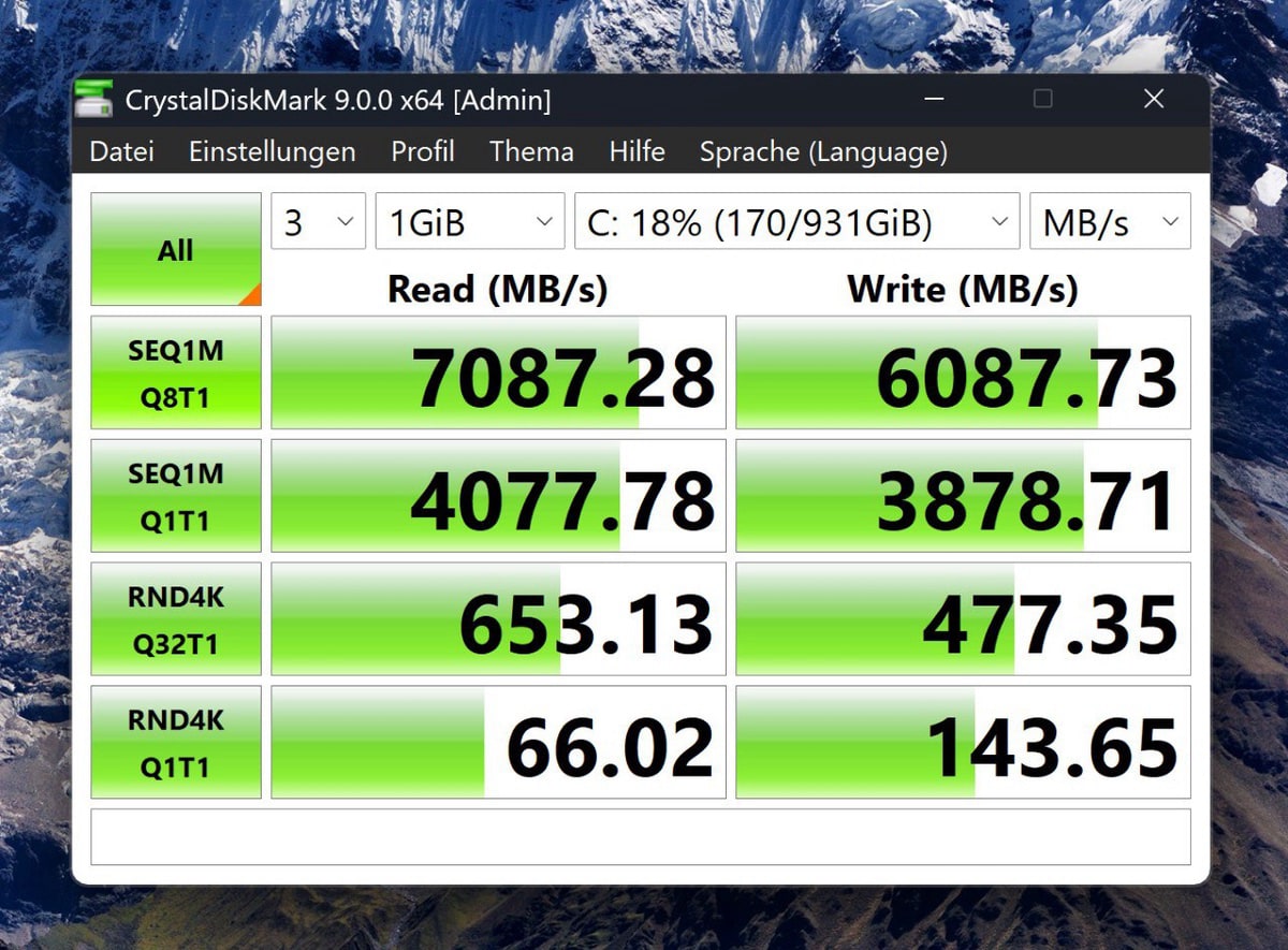 Auch die Anbindung der internen SSD kommt man sehr nahe an die Daten auf dem technischen Datenblatt. Sowohl, was das Schreiben, als auch das Lesen angeht – ein Wahnsinnstempo, was mit anderen Flaggschiff-Notebooks durchaus Schritthalten kann. Das sorgt auch für schnelle Boot-Zeiten und auch aus dem Standby heraus ist das Notebook quasi sofort einsatzbereit.