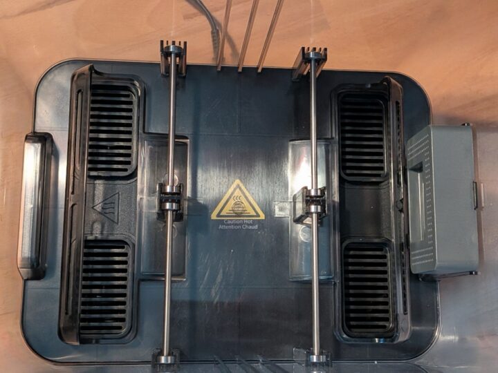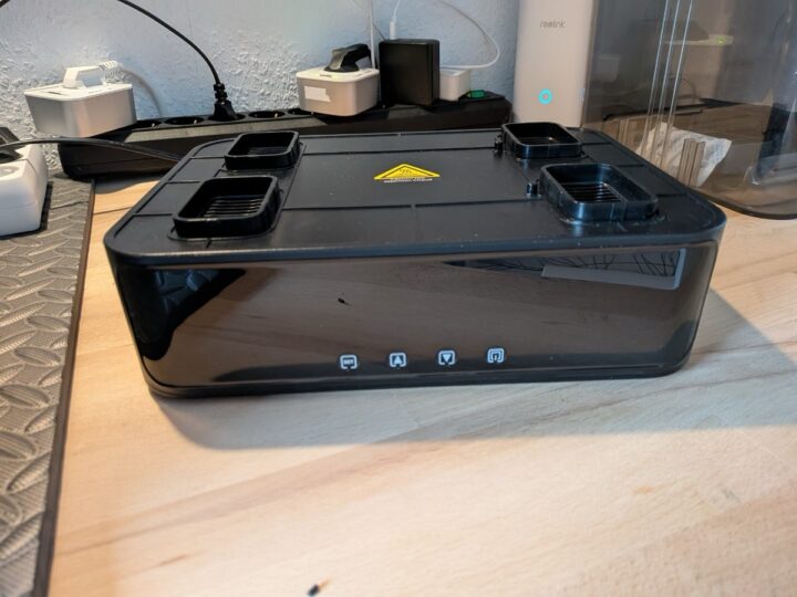 SUNLU wirbt zudem mit einem dreifachen Sicherheitssystem, das Überhitzungsproblemen vorbeugen soll. Das ist gerade bei einem Gerät, das durchgehend besonders heiße Luft erzeugt, keineswegs unwichtig. Einen Mecker-Punkt habe ich aber auch hier. So stellt man die einzelnen Trockenkammern nämlich für den Trocknungsvorgang auf das Heizelement. Durch die vier Öffnungen an der Unterseite der Box strömt dann die heiße Luft ins Innere. Wenn man nun aber aus Versehen dafür sorgt, dass die Box umkippt oder man aber beim Austauschen der Boxen unvorsichtig ist, dann strömt einem diese heiße Luft eventuell ungünstig entgegen. Das sorgt nun nicht unbedingt sofort für fiese Verbrennungen, ist aber sicherlich keineswegs die beste Lösung. Ein Sensor, der den Heizvorgang dann vorübergehend pausiert, wäre hier wünschenswert gewesen.